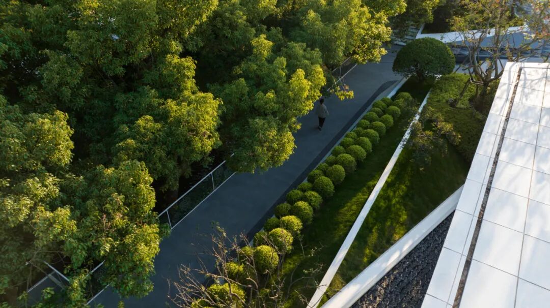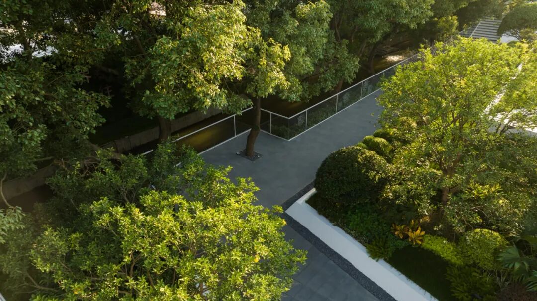 Camphor forest in the background, shallow water in front and folded white pavilion are interwoven and shaded with each other, and the platforms are interspersed and interwoven, blending and penetrating under the dense trees. Create a scene where modern art and leisure complement nature.