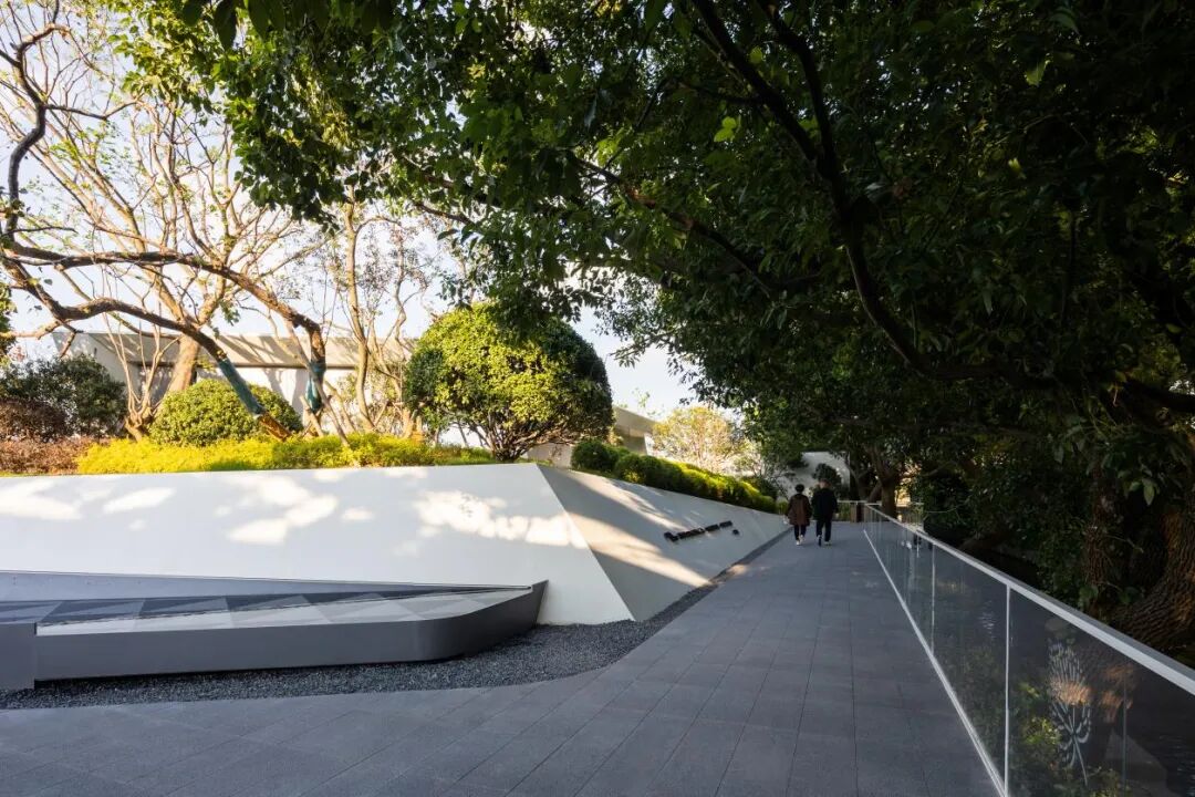 背景香樟林、前场的浅水面与折叠白亭互相交织掩映,平台之间错落穿插咬合,在茂密的树下交融渗透。构筑出现代艺术与闲适自然相得益彰的场景。