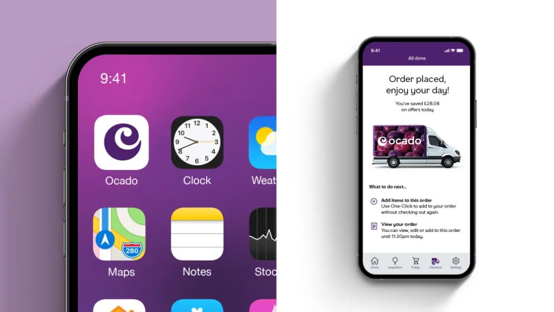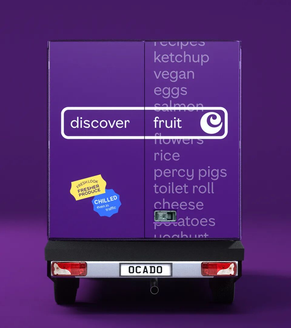 主导市场的绿色已经一去不复返了,取而代之的是甜美的葡萄色。熟悉的漩涡标志也得到了重新设计,使其在静态和动画形式中更加清晰。深紫色可以作为使用中的主色或补色。当应用于 Ocado 的送货车队时,紫色也很突出。虽然王子调色板主导了身份,但其他代表食物的鲜艳色彩和几何图案使包装更加完美。