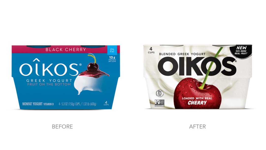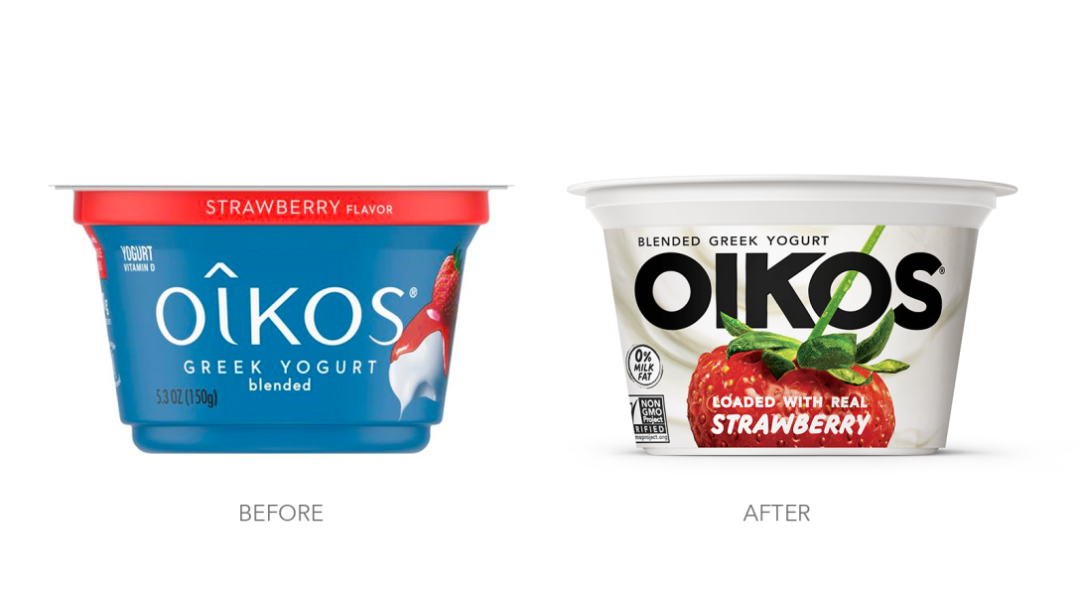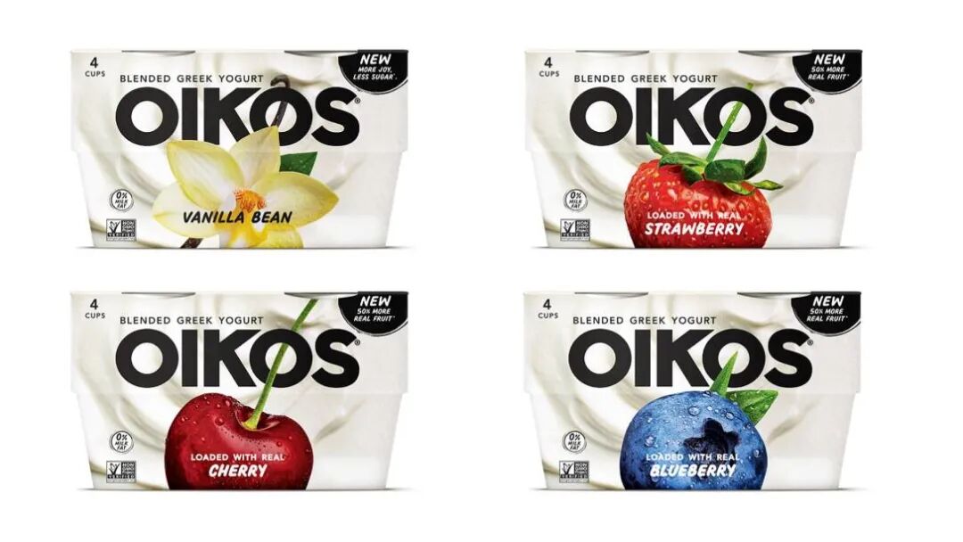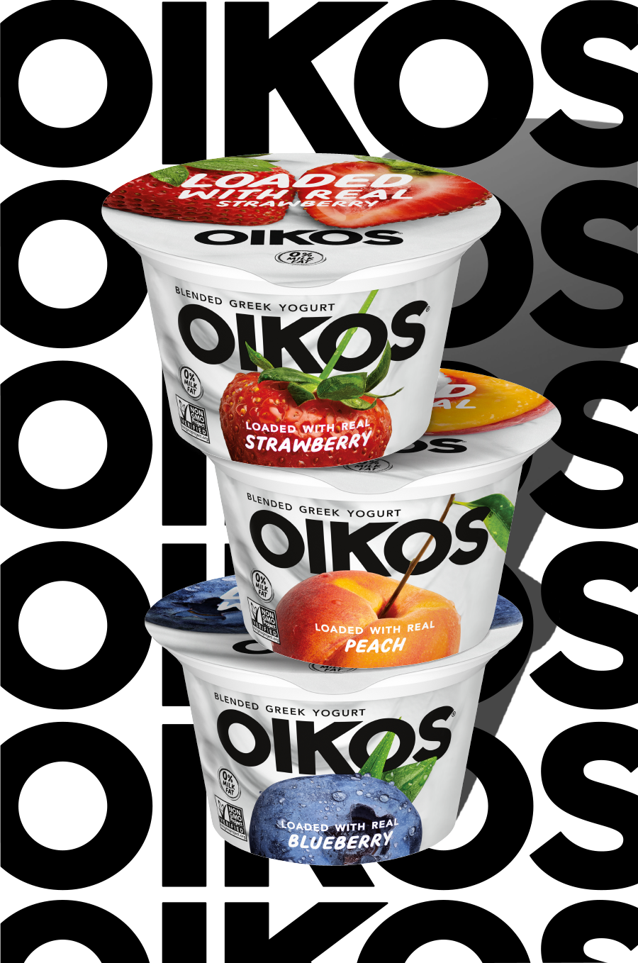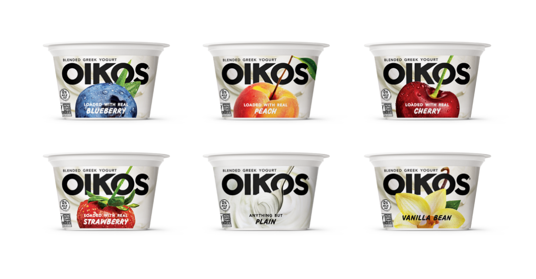 Oikos 的新混合希腊酸奶包装来自达能北美品牌设计公司和代理商 Beardwood&Co.,通过他们的眼孔为消费者提供食物,带有郁郁葱葱、完整和多汁的水果,或者在香草的情况下,前面和中间有一朵鲜艳的花朵。在奶油波浪状酸奶的背景下,配料大胆地脱颖而出。品牌标志设置在一个强大的 sans 中,带有更柔和的二次排版,平衡了包装中更大胆的元素。外包装紧随其后,较大的夸脱也是如此。
