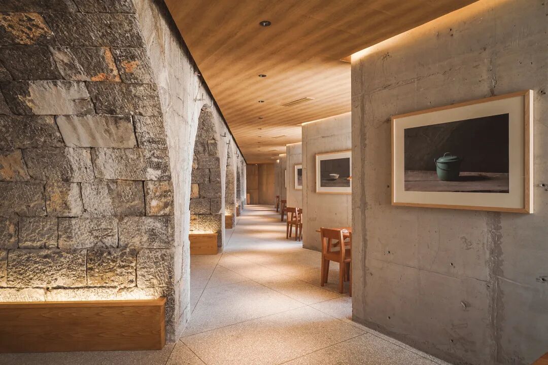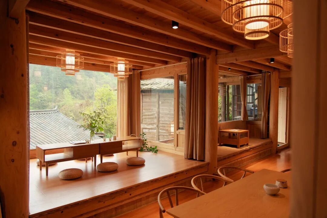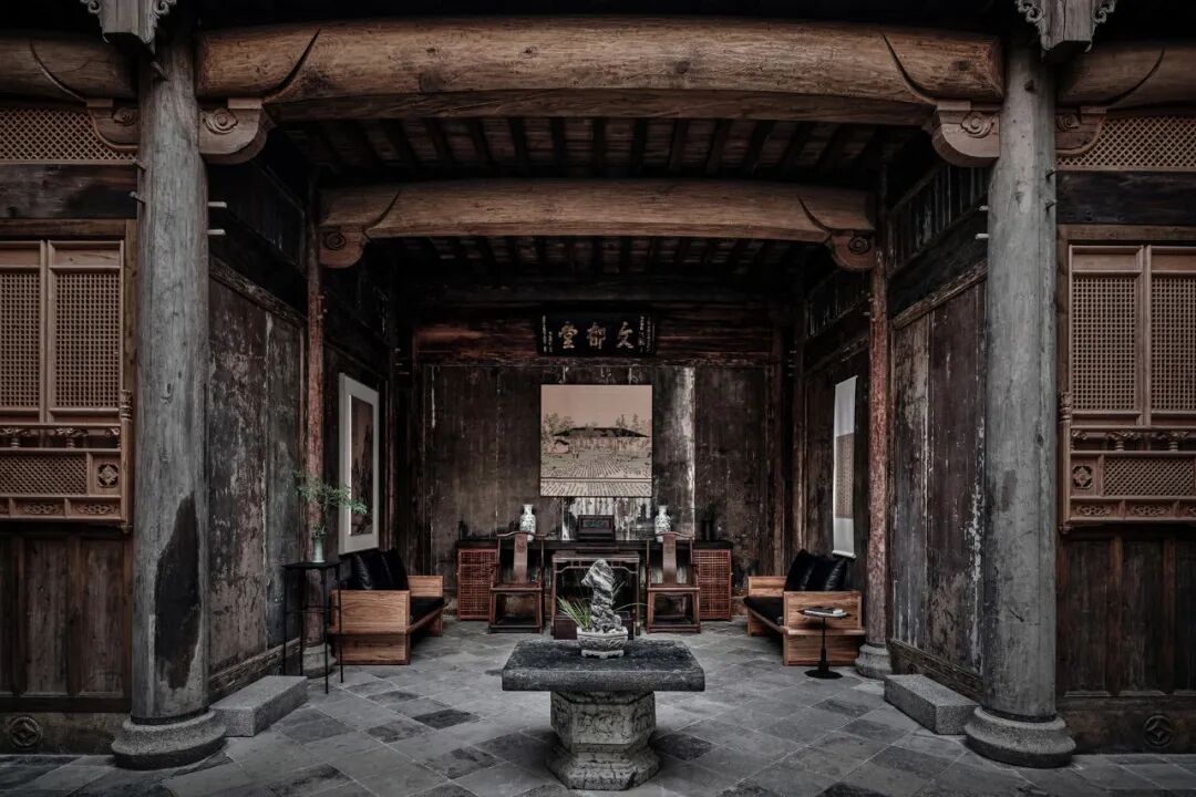 既下山·文郁堂主体为两栋明代建筑:新安中医世家及徽州盐商府邸,于2017年启动修缮改造,历时5年,修旧如初,恢复国保遗产建筑原貌,同时有了现代宜居功能的革新。作为全国唯一的私人收藏酒店,既下山·文郁堂的建筑、家居、字画、器物无一不是原主人的收藏臻品。容纳咖啡厅、餐厅、酒吧、观景台等功能区的“废墟咖啡”由王灏基于徽文化元素设计,这栋三层的当代建筑与文郁堂古建筑分立钟英街(古时官街)两边,古今对视,文人快意生活方式与当代时尚生活方式形成对话。