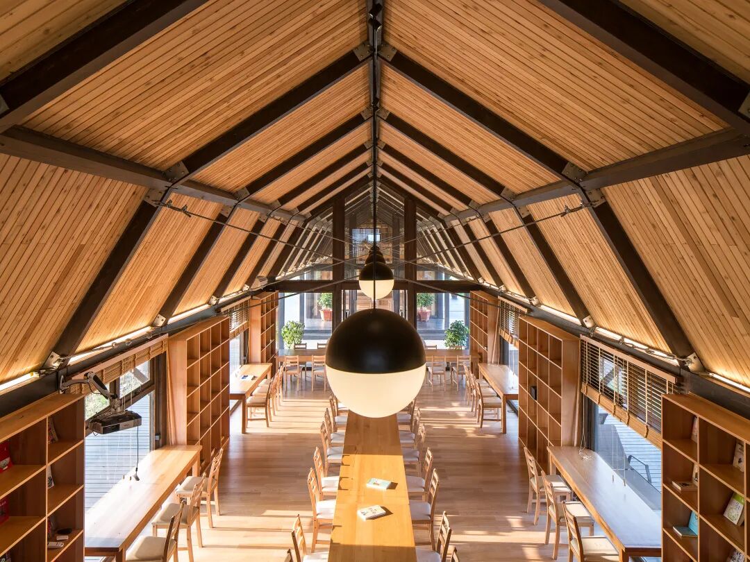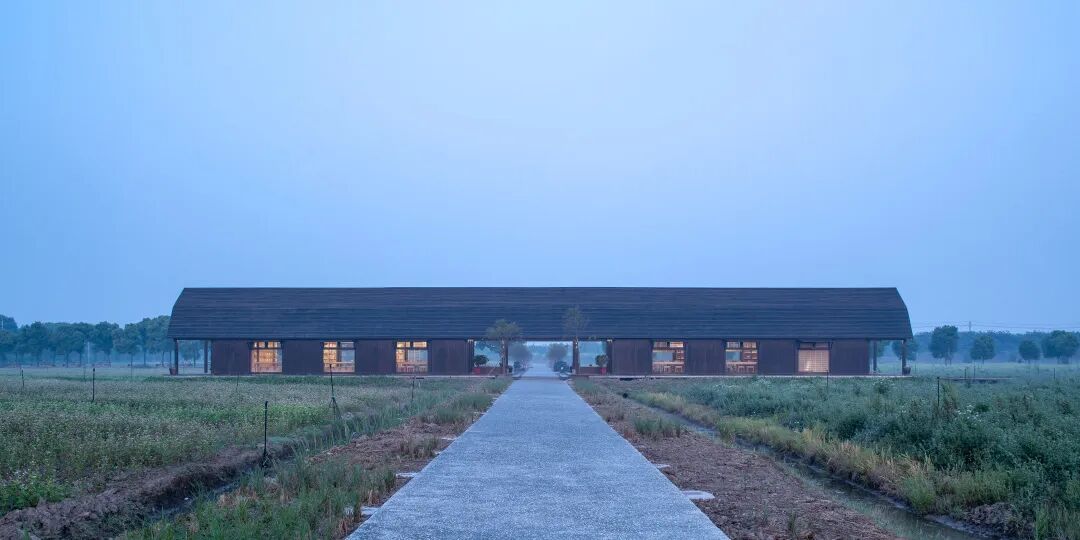 华腾田中央图书馆安安静静地躺卧在田中央,成“一”字形,长约40米。从远处看,图书馆像谷仓,暗暗的木板表面像是经过多年风吹雨打之后留下的岁月烙印,看上去沉稳,谦逊,不与周遭抢空间,不与环境争颜值。这种不争不抢的状态反倒让周边的一切都成了图书馆的一部分,它不再局限于200平米的室内空间,从窗户望出,视线所及之处,都是图书馆的一部分。