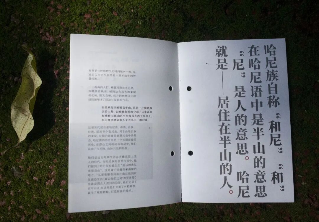 “FARLAND远方之地”把地方乡村视角落在了云南省红河哈尼族彝族自治州菁口村,呈现了一本讲述哈尼族住房智慧——蘑菇屋的独立刊物。本书内容重点以人类学调查和非虚构的描摹再现当地人生活的智慧和背后的文化逻辑,用观察白描的方式沉浸式让读者感受到当地风土、生活。设计版式的独特之处则是采用了手写当地谚语的方式,来模仿当地人拙朴的地方文化表达的视角。