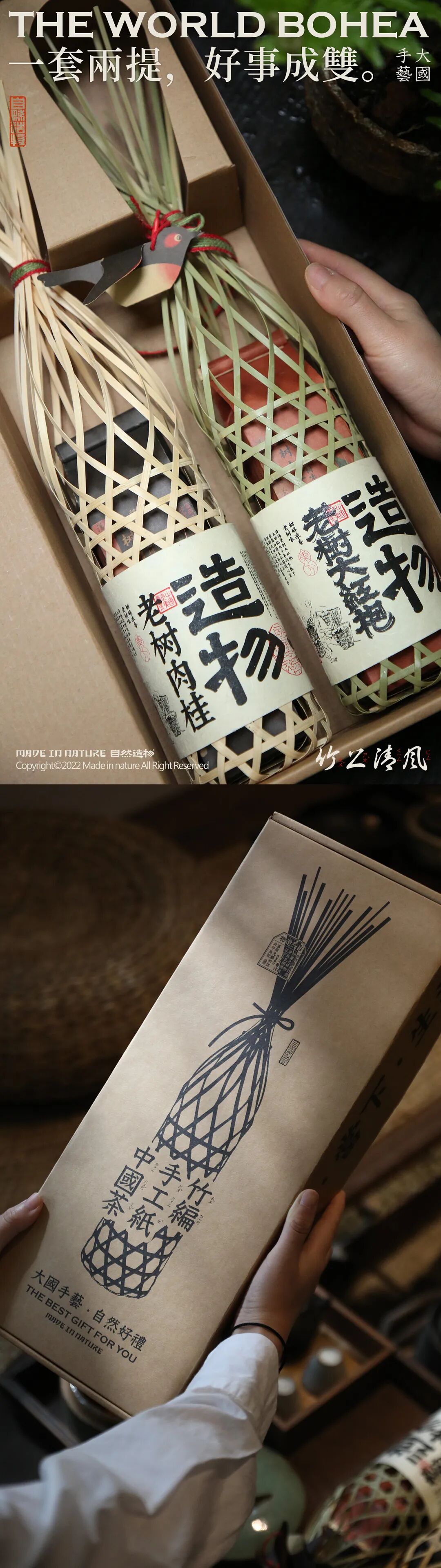 武夷岩茶,源自武夷山国家森林公园核心茶产区四十余年老树,其特点为浓郁的花果甜香,似桂花、橙花、蜜桃,并有特殊的桂皮香和老树木质香,口感辛锐刺激,回味甘甜。国家非遗大红袍制作技艺传承人监制,坚持传统制茶的十八道工艺,安全放心。运用可再生竹材料进行包装,从环保立场出发,围绕可再生做出尝试与改革,告别丢包装的生活美物。