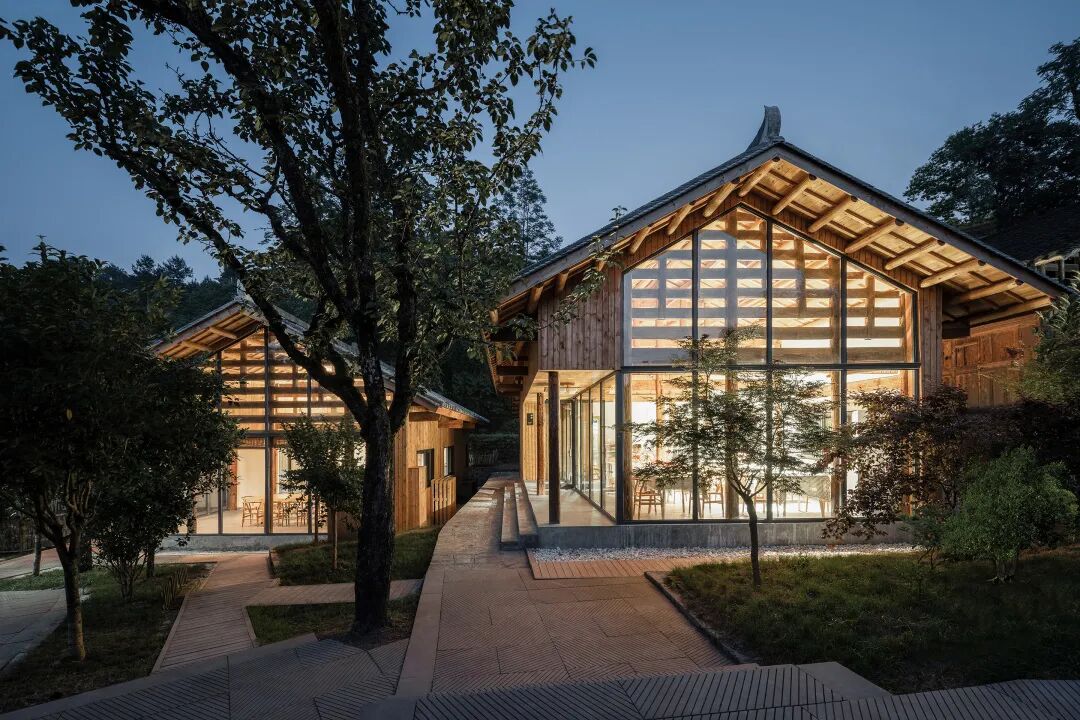 山水柴院基于对四川民居结构和空间的转译与重组,建筑采取十字风车型布局。十字空间徐徐延展,嵌入自然景观。穿斗木结构轻盈灵巧,屋面挑檐低矮深远,充足的檐下空间保证通风、遮蔽风雨。因地制宜的自然生长模式也使其形成独特的建筑聚落形态。建筑外墙就地取材,以不同尺寸的柴木穿挂成墙,透而不通,开而不敞;内侧采用鱼鳞状红砂岩块砌筑,丰富的肌理与柴呼应。