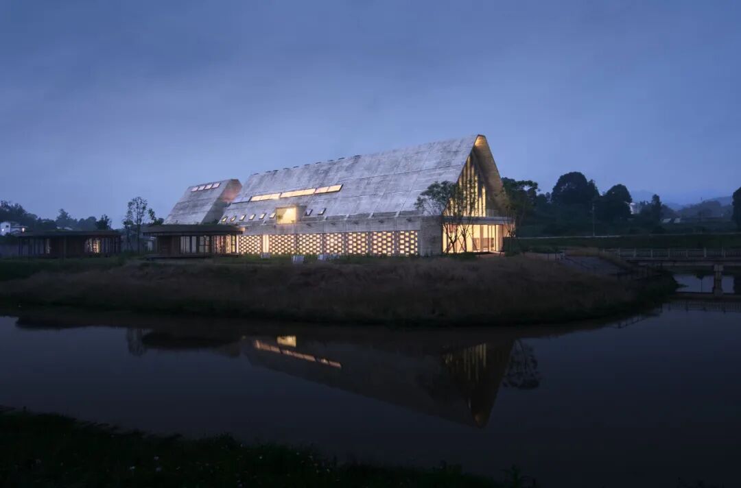 整个项目定位为“释放天性的乡村俱乐部”,希望鼓励人们来到乡村换个内在心境,释放天性,感受快乐。大地美术馆的设计理念为“高粱地里的水泥粮仓”,是一座高粱地里的清水混凝土建筑,以“拙”为基调,用现代的手法诠释质朴的精神,尺度上的些许放大和形式上的些许传承共同作用于乡村内在气质的延续,用独具精神性的轴线动线和和三角形的立面去营造庄严神圣的感受。
