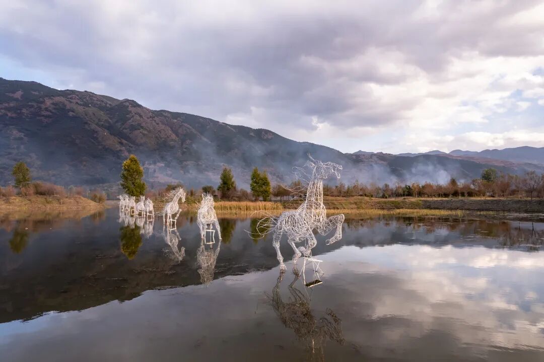 “白驹过隙”是凤羽“露天美术馆”装置艺术作品之一,由在地艺术家周正昌创作于2018年。作品由钢筋编织的八匹形态各异的“骏马”组成,八匹马各有其名,取自天马山下的八个村庄:雪梨、正生、凤河、马甲、草甲、屯户、松发,单匹马长4米、宽1米、高5米,在蓝天白云的映衬下,八匹骏马在风雨佛堂村前的湿地公园水面上,沿天马山麓由东向西飞驰而过,象征时间与生命的流逝。