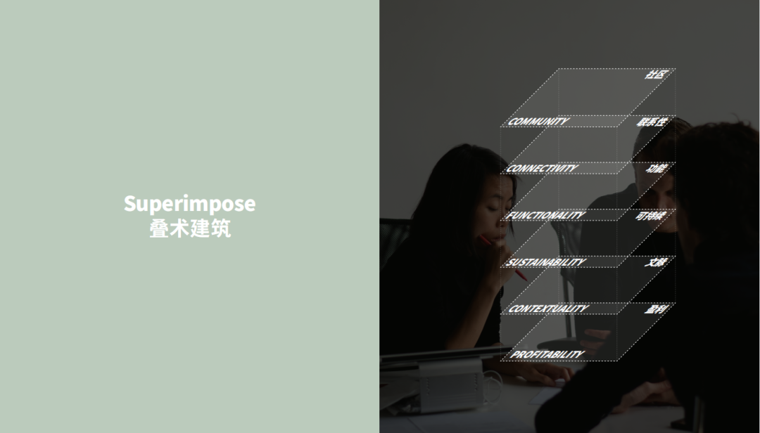 其实我们的公司名称叠术建筑事务所的含义即代表我们对设计的概念,叠的意思是使一物与另一物占有相同的位置并与之共存,术代表方法和方式,这就是我们需要在建筑上做的事情,也就是说我们怎么样能够层层叠加出一个建筑,包括社区、联系性、功能性、可持续性、文脉性、盈利性,都要层层叠加在一起,然后和业主一起来合作达到共同的目的。同时叠术的名字也反映了我们团队的人员策略,我们团队成员选择是基于多样性,而不是相同性。