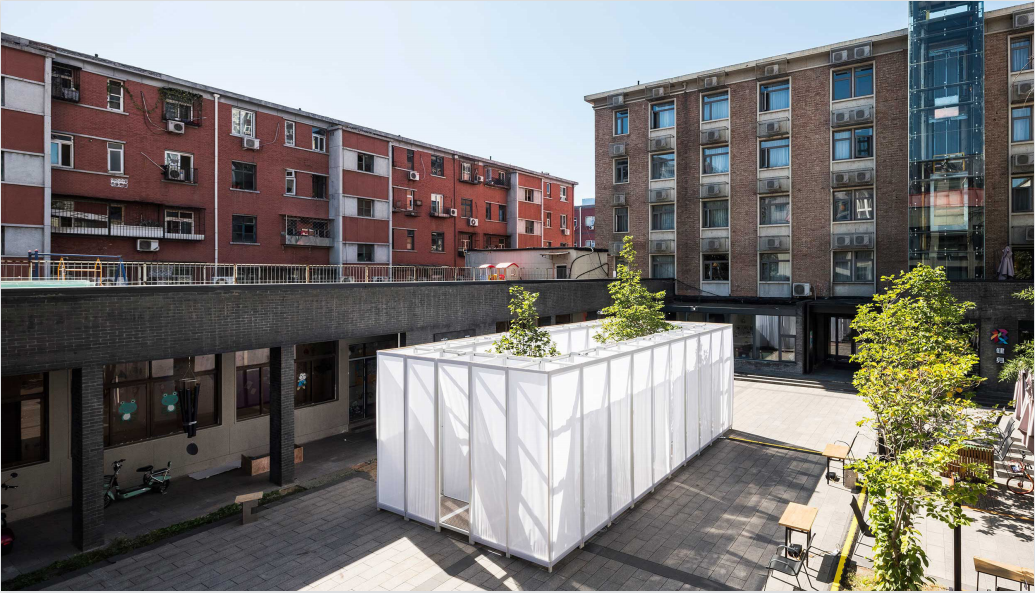 因为四周被围起来的缘故并位落在北京设计周的庭院中,这个装置看起来像是庭院中的庭院,在这空间当中,我们又能够找到更多小的空间,有更多的禅意。因此我们认为这个空间不一定要与位置有关,也可以是和里面的活动、材料有关,以及人在这里做什么事情。