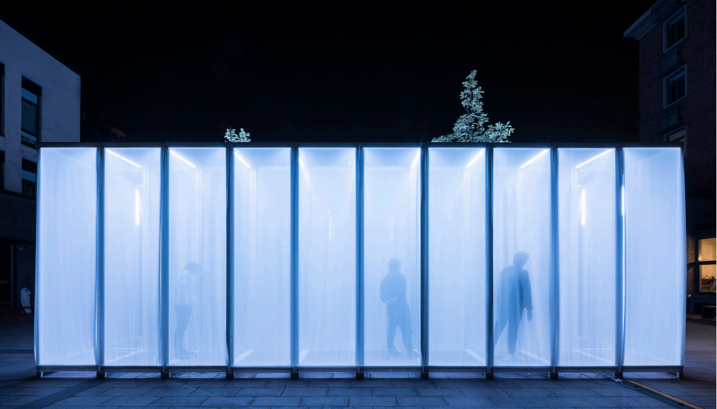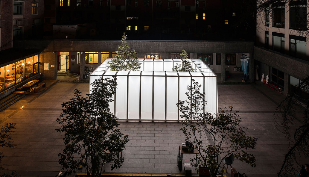 首先这个装置会有一个进入的入口,通过四周的走廊进入庭院当中,中间的庭院空间可以让人在里面做不同的事情,产生更多的可能性。因为里面设置了灯光投影,所以晚上会亮起来,同时晚上我们会开启烟雾制造器,制造出烟雾弥漫的感觉。