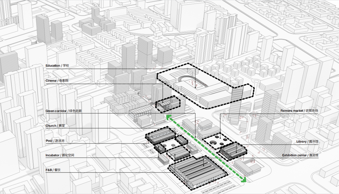 我们重新组织规划了这一块原有的建筑,带来一些新的功能,例如农贸市场、图书馆、展览馆等等。这些都能给周边的环境带来各种不同的价值,我们在原有的基础上把这些旧的建筑得到新的价值提升,并且从建筑的角度说服了客户告诉他们这样能够利润最大化,因此到了第二阶段,第二期和第三期我们又做了更多这样的设计。
