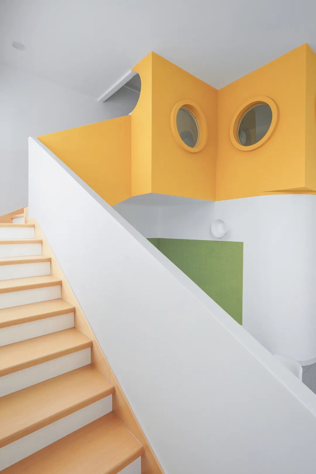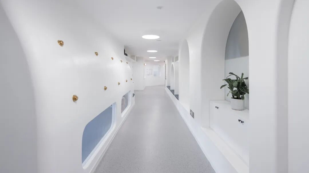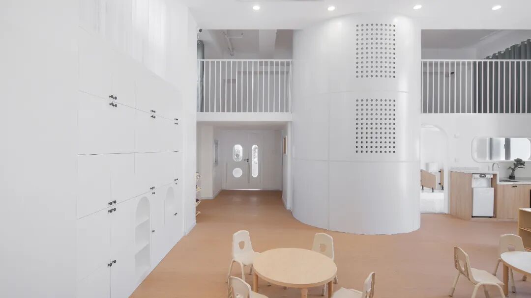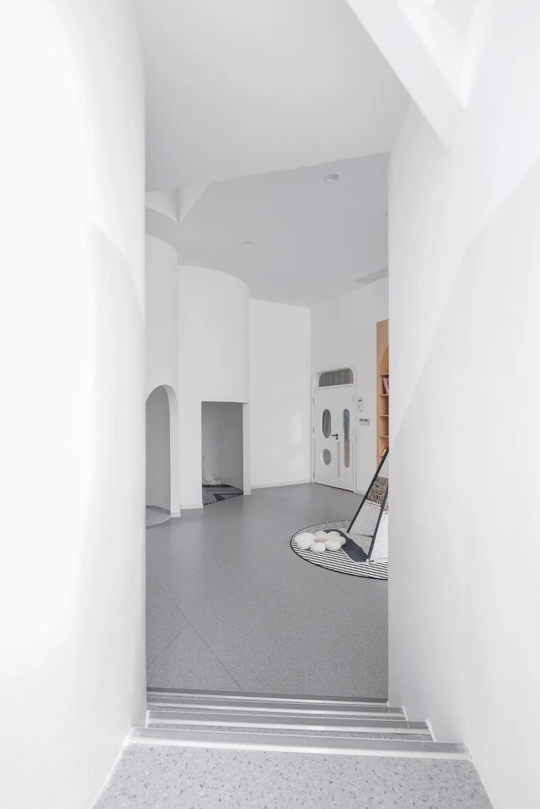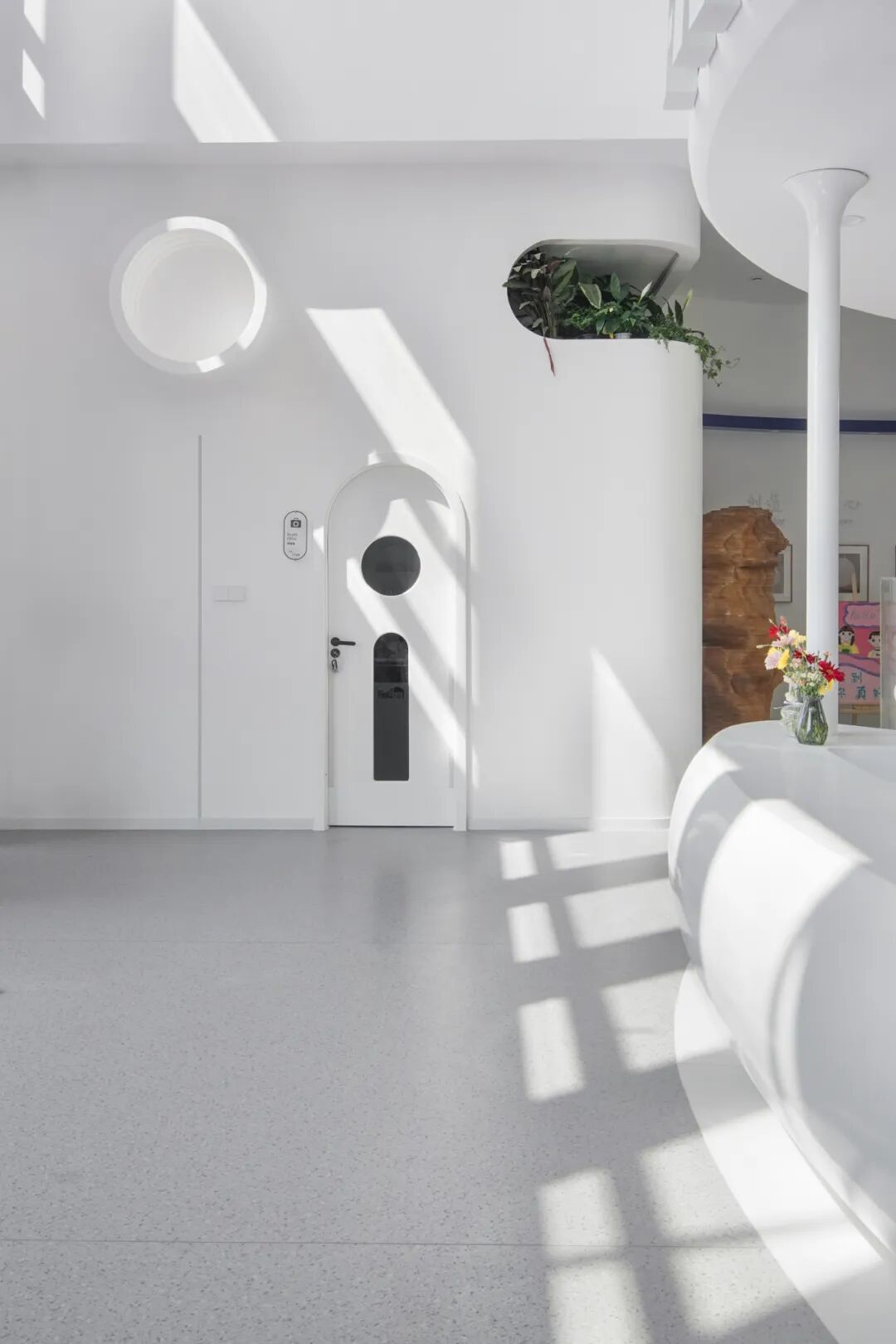 每一层的走廊都贯穿了整层的行为动线,优先所需功能的丰富度,优化各功能的体验品质,大面积的白色则是对童真简单和纯粹的保护。