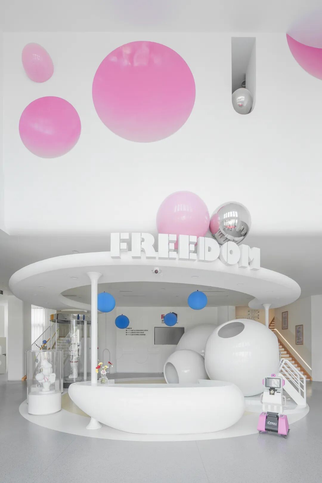 根据瑞德姆儿童中心的自身属性的综合性和独特的认知角度,设计让整个空间都以白色为主基调。结合原有建筑的基础上,增添模拟未来感的元素,未来科技感的装置,通过惊喜、有趣和好玩的元素来活跃室内空间,成为孩子们最常接触的场地,