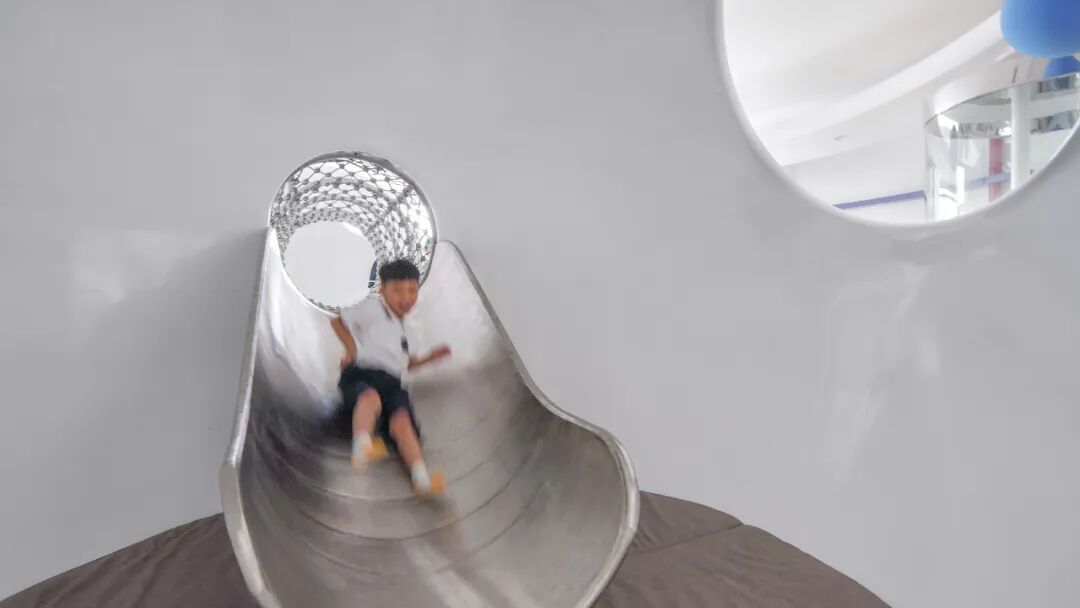 当天朗风清、阳光和煦之时,孩子们在滑梯上嬉戏玩耍,空间本身的限制仿佛消失,孩子们奔跑在属于他们的土地上,感受微风轻拂。