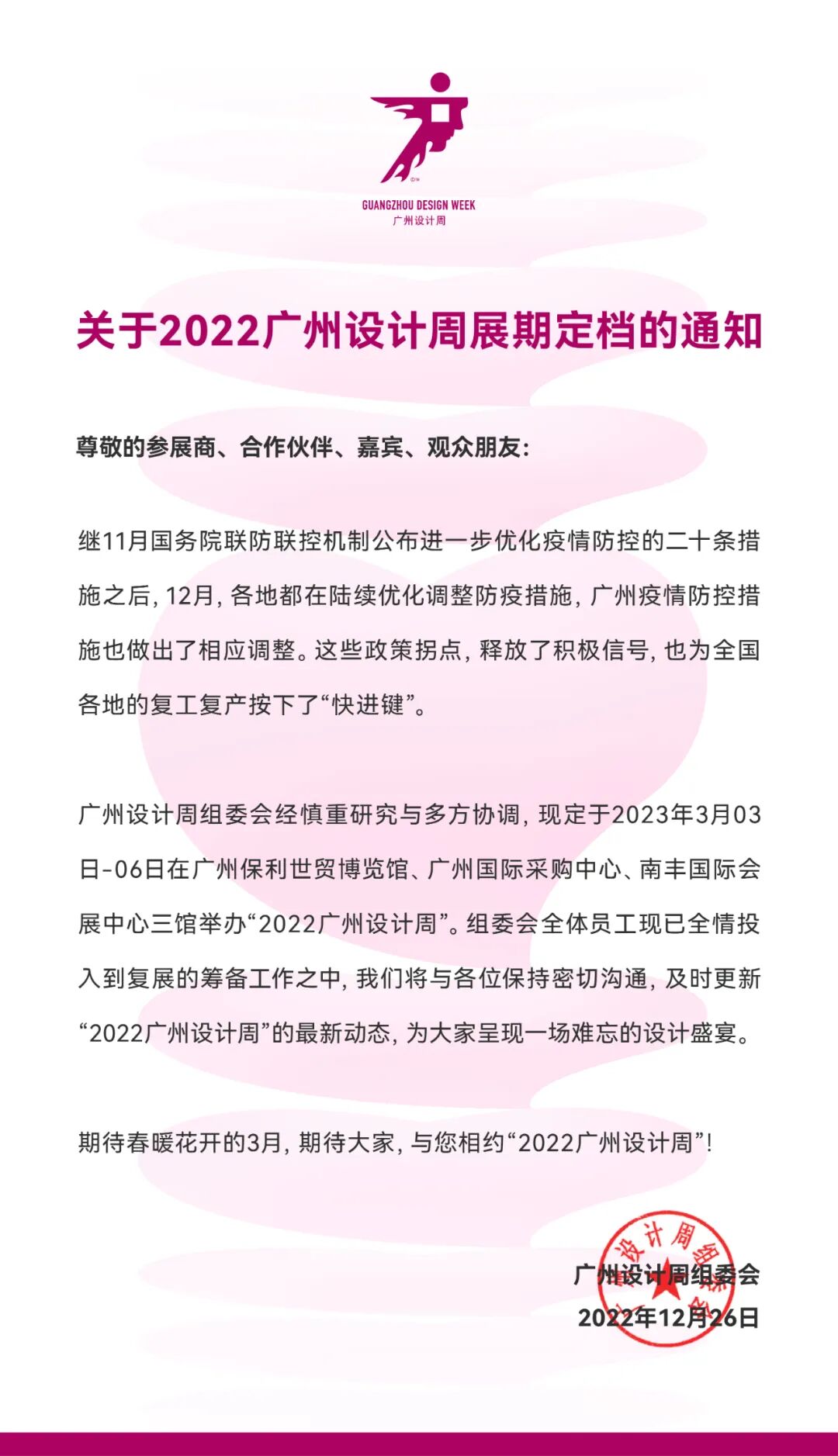 2022广州设计周以“热爱PASSION”为主题,将于2023年3月3-6日(四天)在“广州保利世贸博览馆+广州国际采购中心+南丰国际会展中心”三馆举行,展览方向为“当代人居生活美学新业态的设计+选材”,展览规模达18万㎡,汇聚来自全球20+国家逾1000家适于当代人居生活美学新业态的设计/文创/艺术/潮流/智能/软装/材料/高定/生活方式等领域的品牌企业和机构,及40+超级策展项目联合展出,同期将举办超150场涵盖“新商业/文创/地产/设计/艺术/时尚/潮玩//生活美学”等方向的主题活动,以及遍布展馆内外的近100场音乐/舞蹈/曲艺/杂技/脱口秀/创拍秀/行为艺术/未来时装秀/机器人表演等多元形式的文艺表演节目,构成“三馆联动、更大规模、更多内容、更富商机”的庞大又新颖的展会格局,继续领衔亚洲设计产业第一规模大展。
