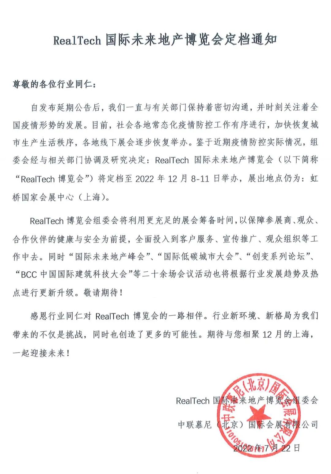 自发布延期公告后,我们一直与有关部门保持着密切沟通,并时刻关注着全国疫情形势的发展。目前,社会各地常态化疫情防控工作有序进行,加快恢复城市生产生活秩序,各地线下展会逐步恢复举办。鉴于近期疫情防控实际情况,组委会经与相关部门协调及研究决定:RealTech国际未来地产博览会(以下简称“RealTech博览会”)将定档至2022年12月8-11日举办,展出地点仍为:虹桥国家会展中心(上海)。