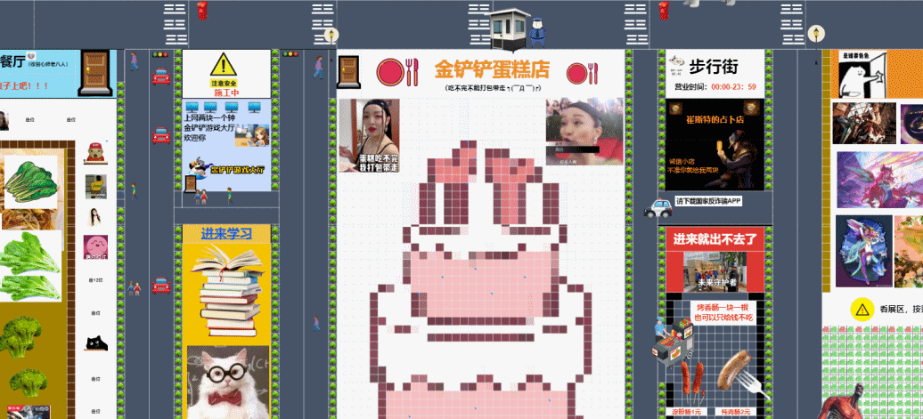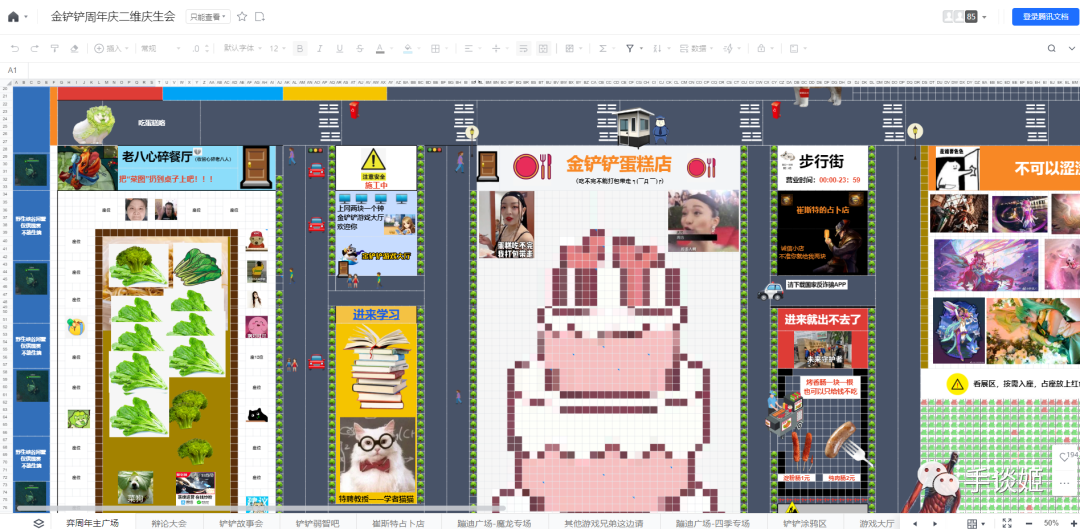 原来,恰逢金铲铲之战周年之际,玩家们用在线文档搭建了一个庆生广场,搞怪的、整活的,广场中充满烟火气——