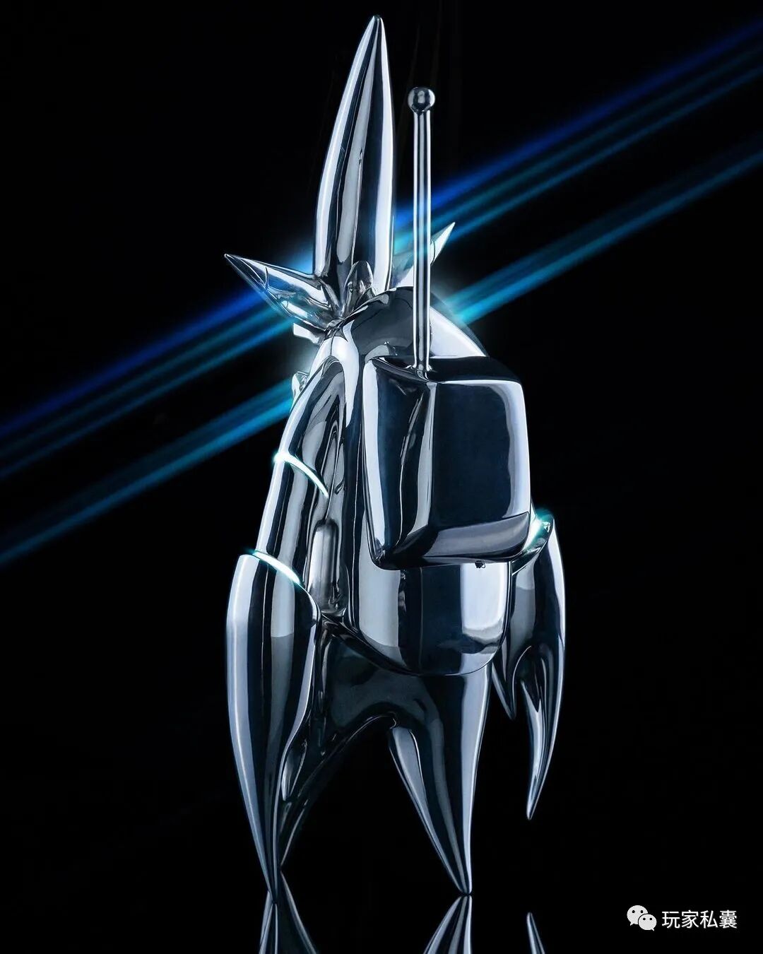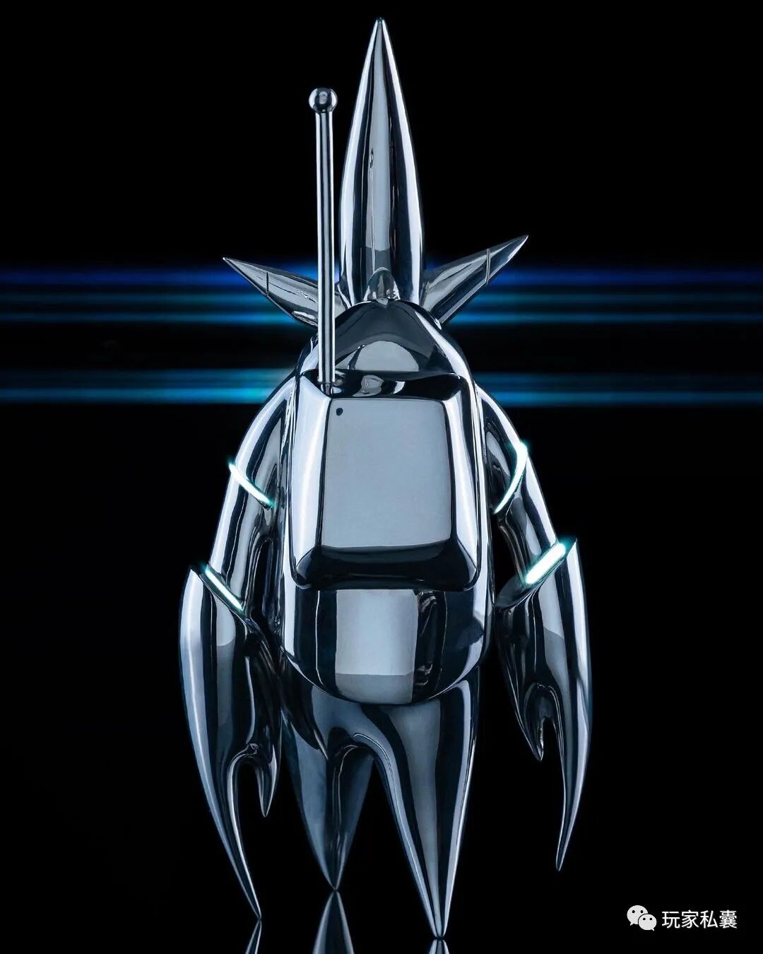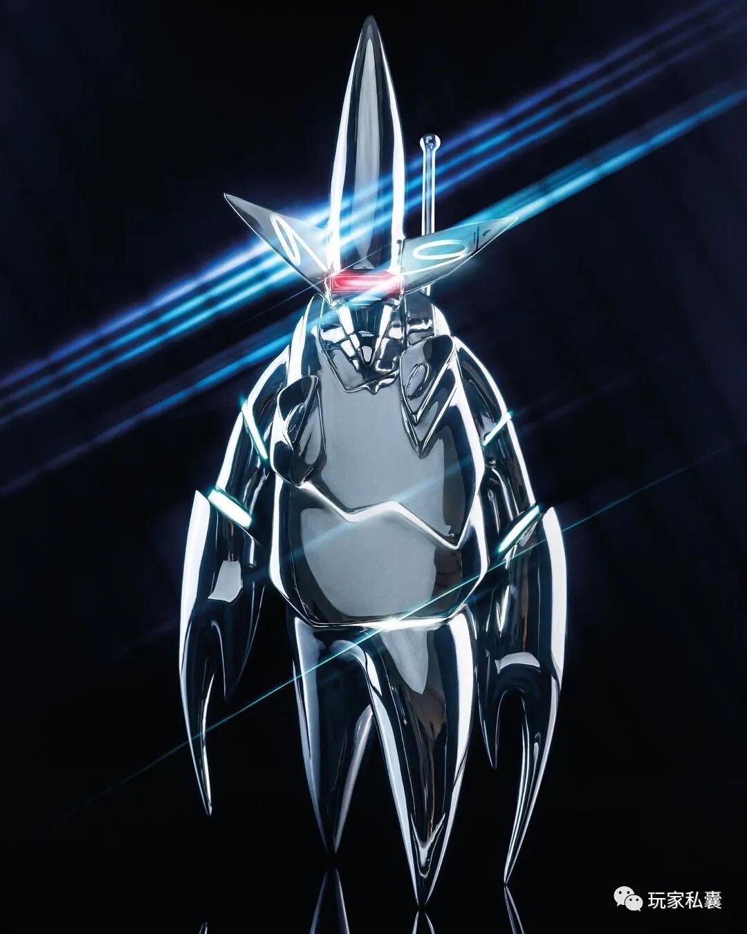 Futura手上托着的不锈钢雕塑就是将于2月3日抽签认筹的AV-001L,全球限量75枚。采用高抛光不锈钢材质,模型上具有两种氛围光特效,白色闪电般的线条光与眼睛部位的红色激光式效果,组合出一种外来生物般的奇幻形象。