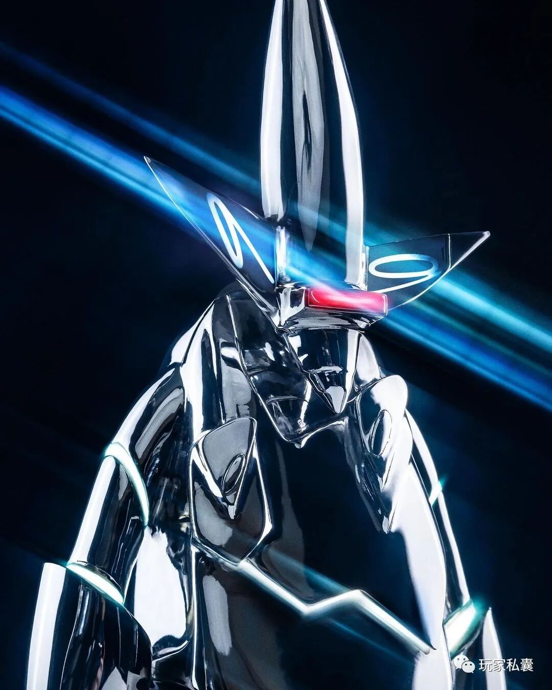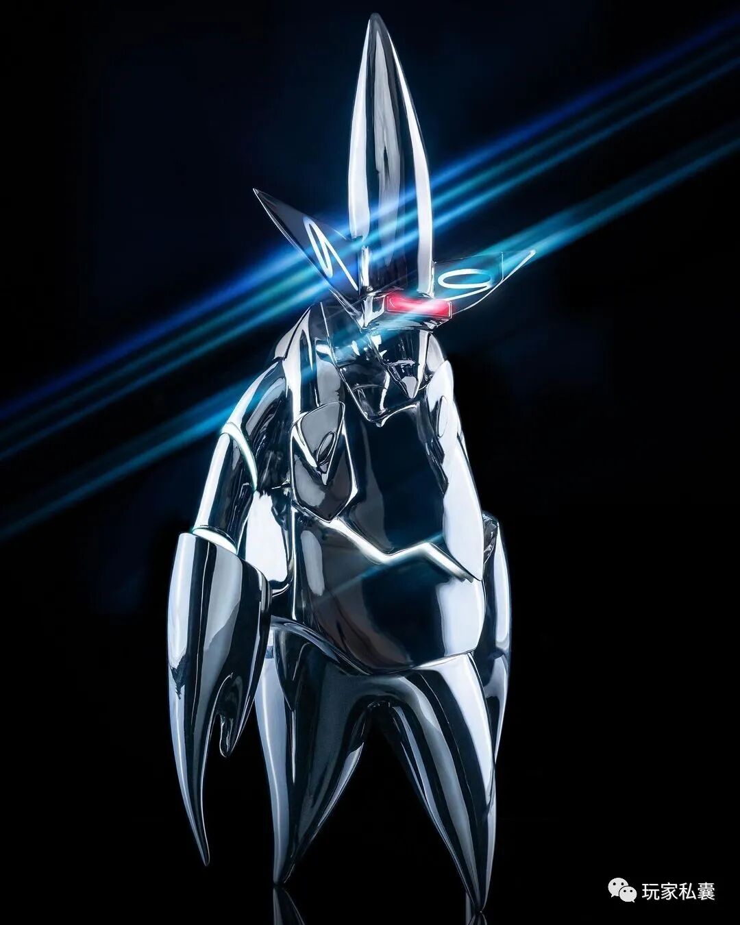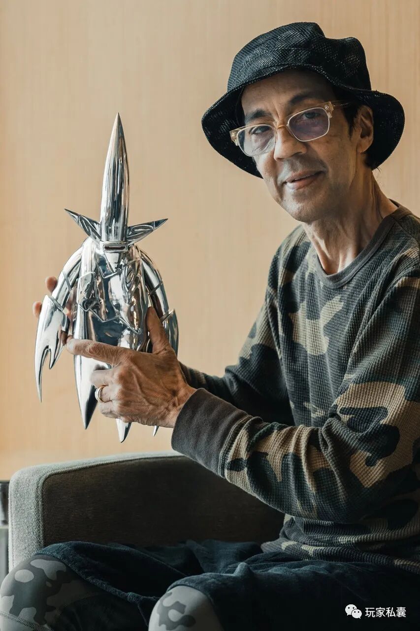 Futura手上托着的不锈钢雕塑就是将于2月3日抽签认筹的AV-001L,全球限量75枚。采用高抛光不锈钢材质,模型上具有两种氛围光特效,白色闪电般的线条光与眼睛部位的红色激光式效果,组合出一种外来生物般的奇幻形象。