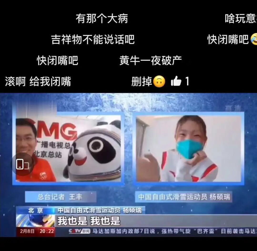 冰墩墩扮演起了记者的角色,跟杨硕瑞对话,但由于声音老成憨厚,听起来像个中年大叔,引起了网友不适,“别让义墩墩看到”。