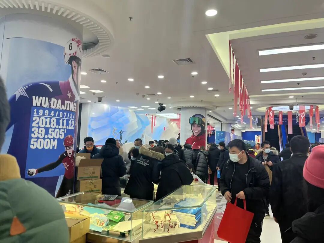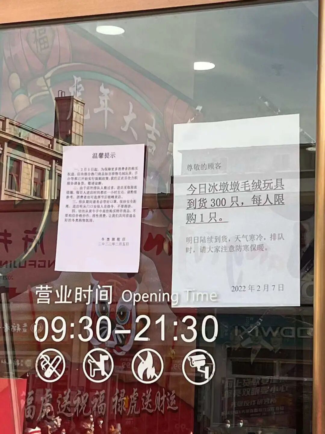 下午1点半,我终于挤进了店里,工美大厦门口贴着告知:今日冰墩墩毛绒玩具到货300只,每人限购一只。
