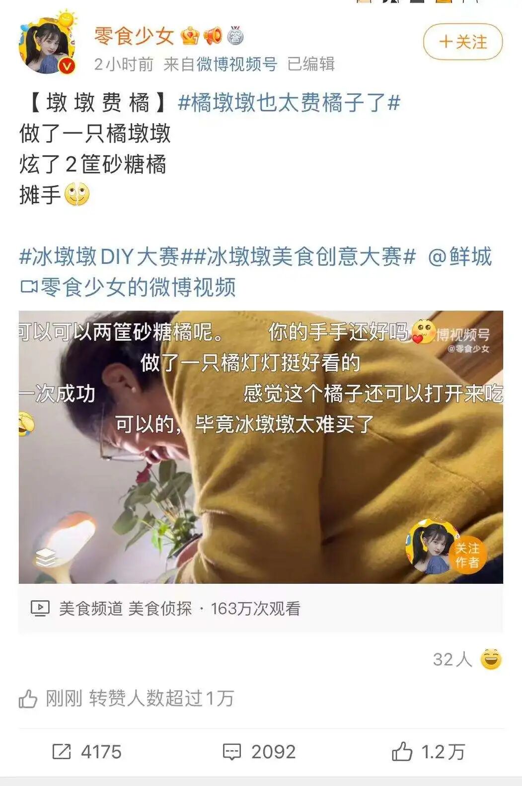 有博主晒出了自己做一只橘墩墩,炫了2筐砂糖橘的视频,被网友调侃道,缺点就是太费橘子了。