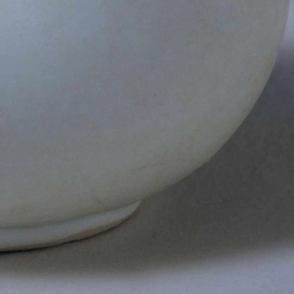 水丞敛口,器身圆鼓,圈足,外底刻行书“官”字款,胎体轻薄,细腻坚致,通体内外施白釉。
