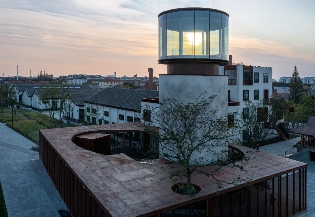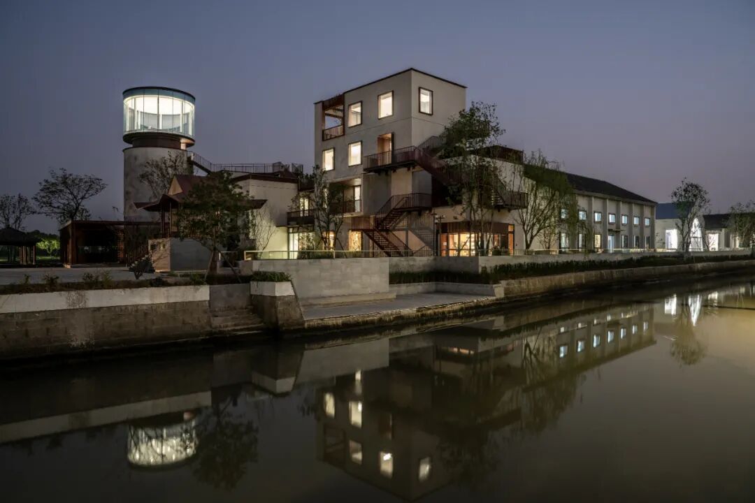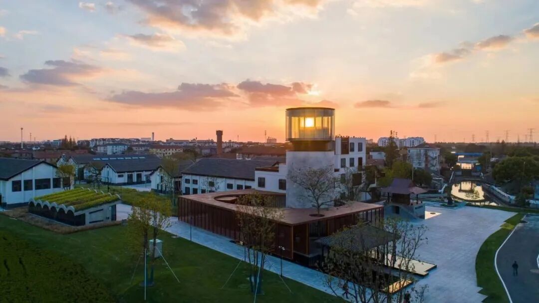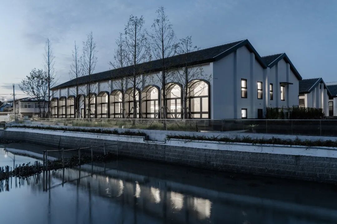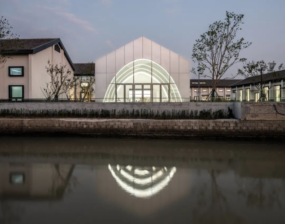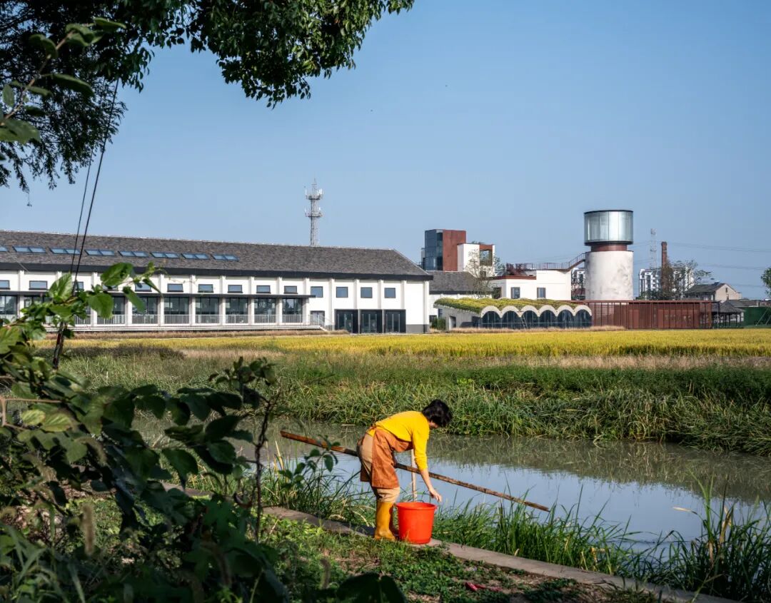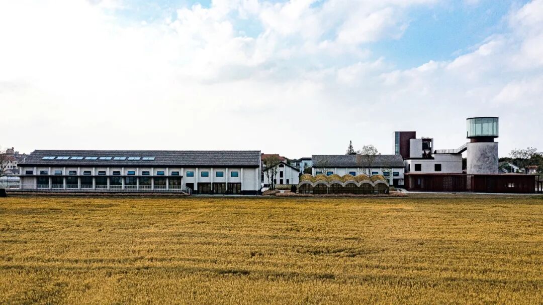 同时增建紧临稻田的农创空间“田歌阳台”,以原有厂房的拱形元素为母题,建筑通过尺度过渡与绿植屋面融入周边生态稻田。