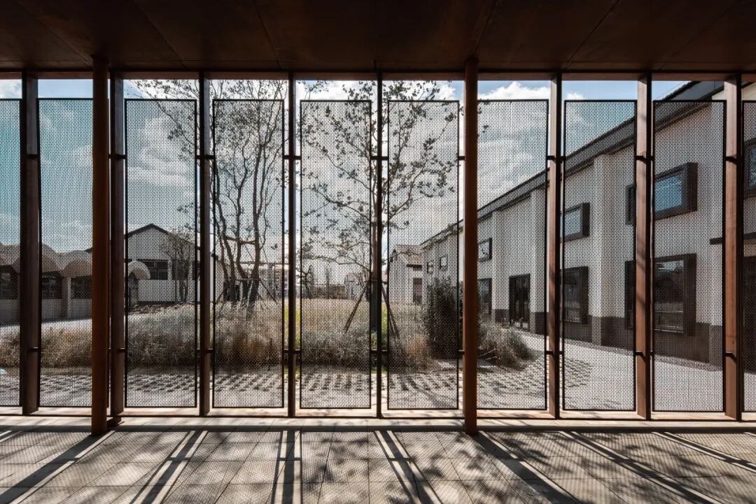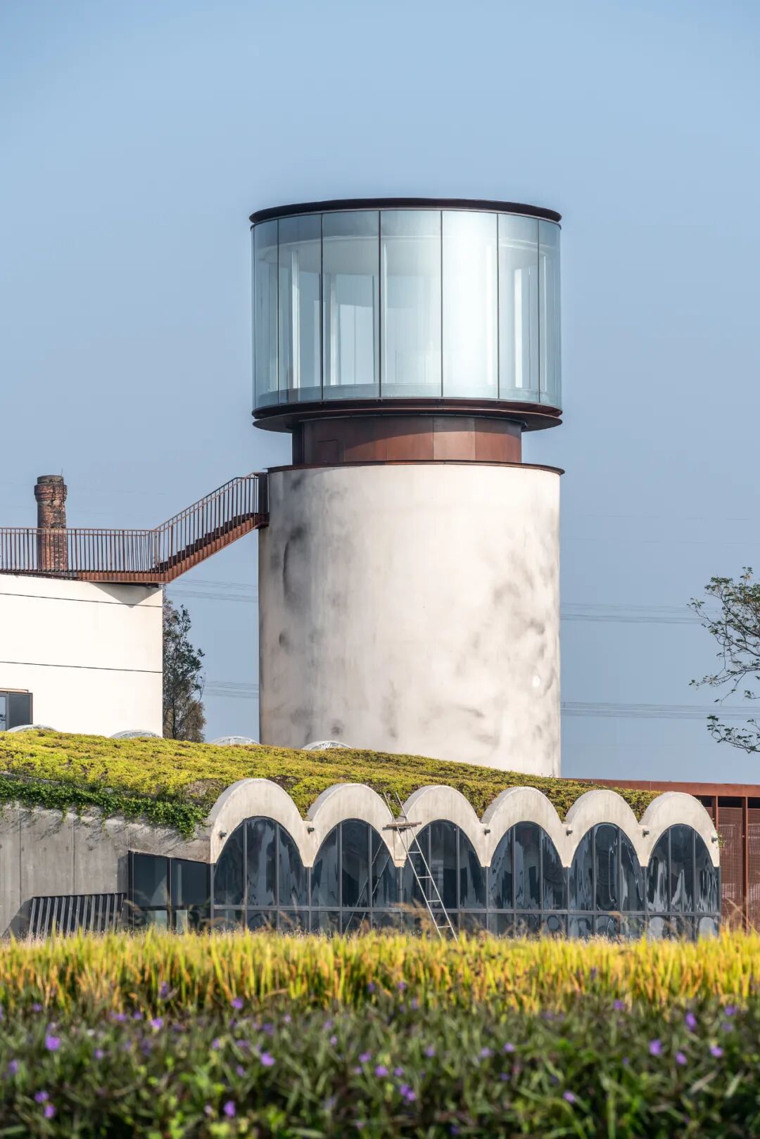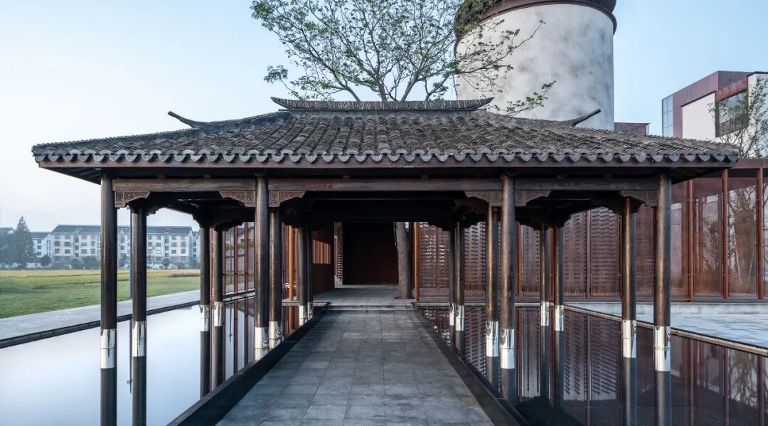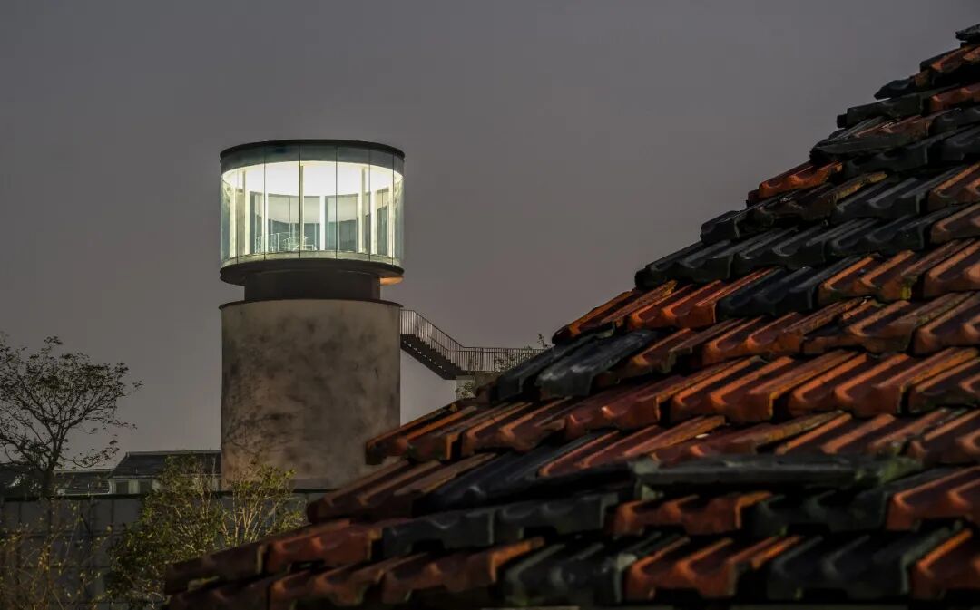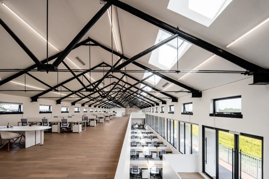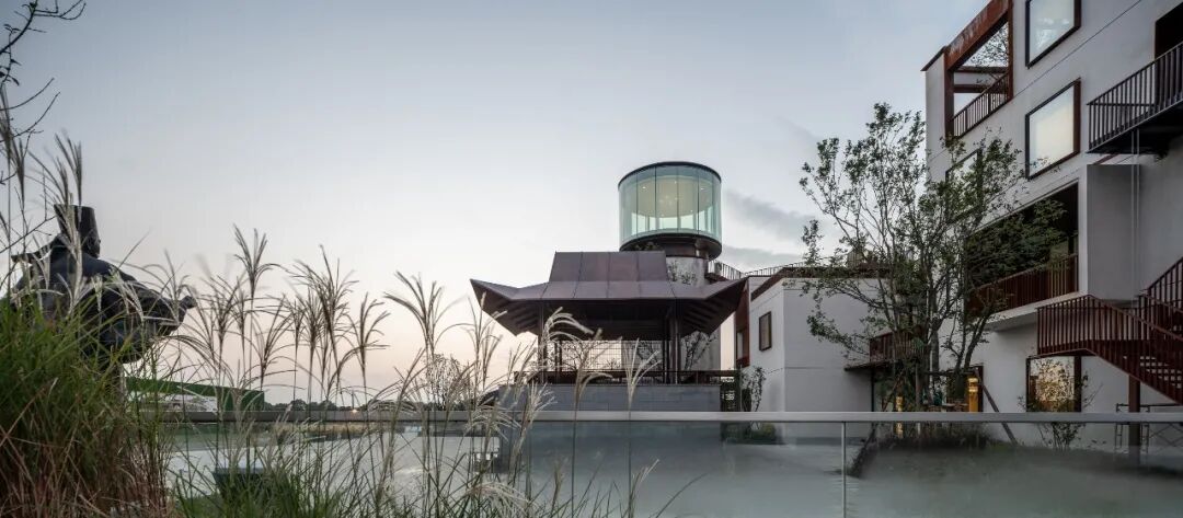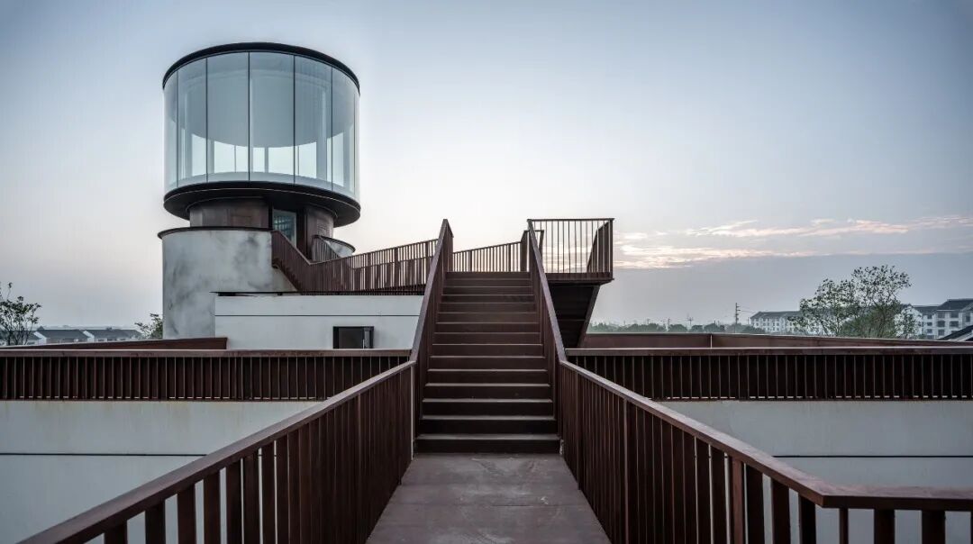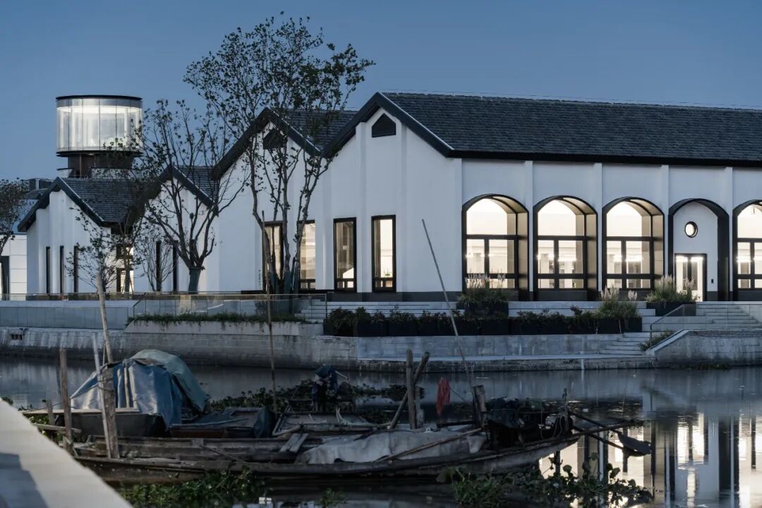 同时增建紧临稻田的农创空间“田歌阳台”,以原有厂房的拱形元素为母题,建筑通过尺度过渡与绿植屋面融入周边生态稻田。