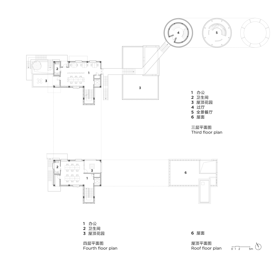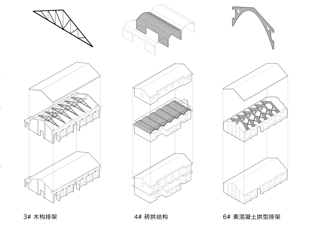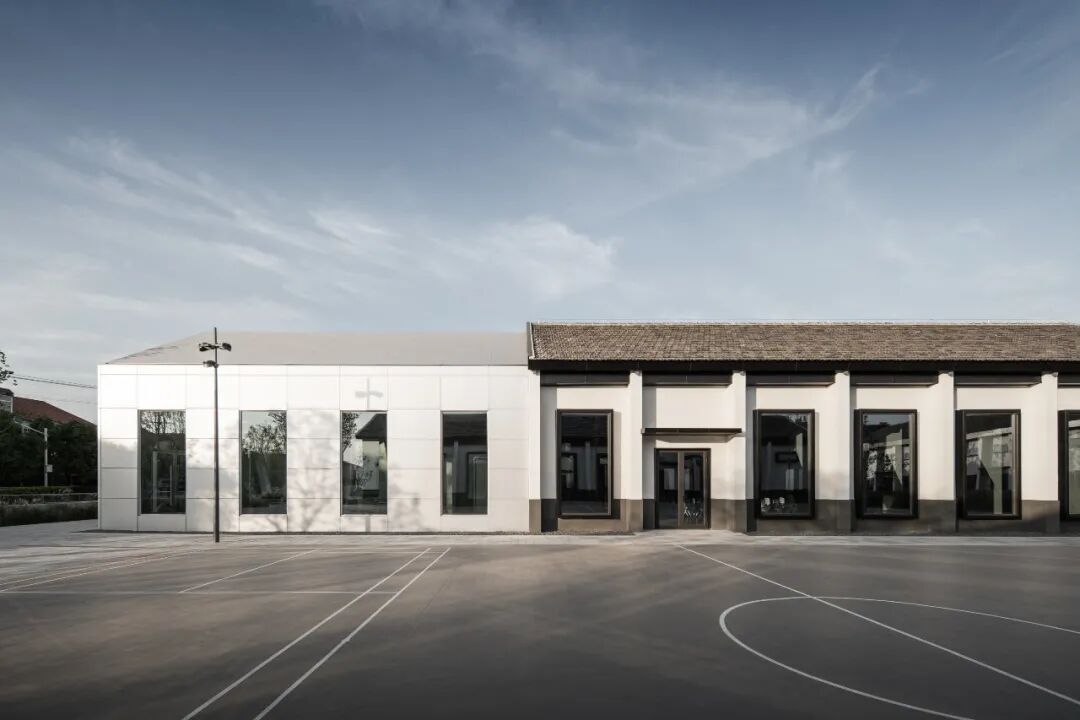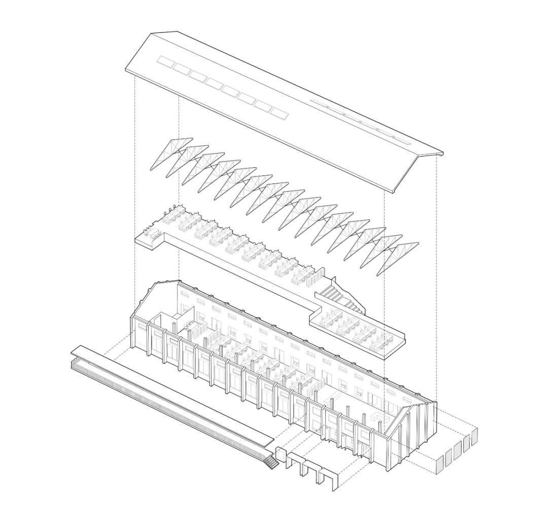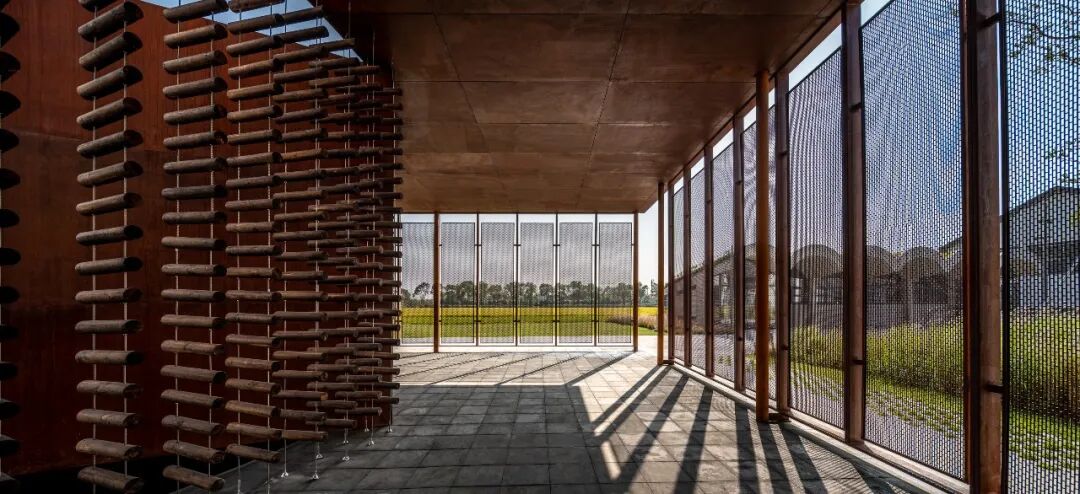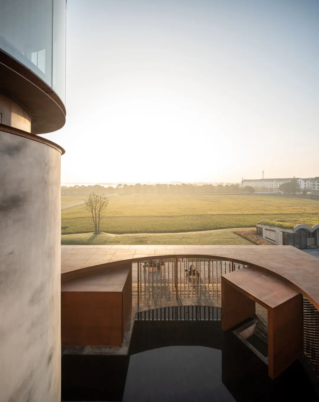 同时增建紧临稻田的农创空间“田歌阳台”,以原有厂房的拱形元素为母题,建筑通过尺度过渡与绿植屋面融入周边生态稻田。