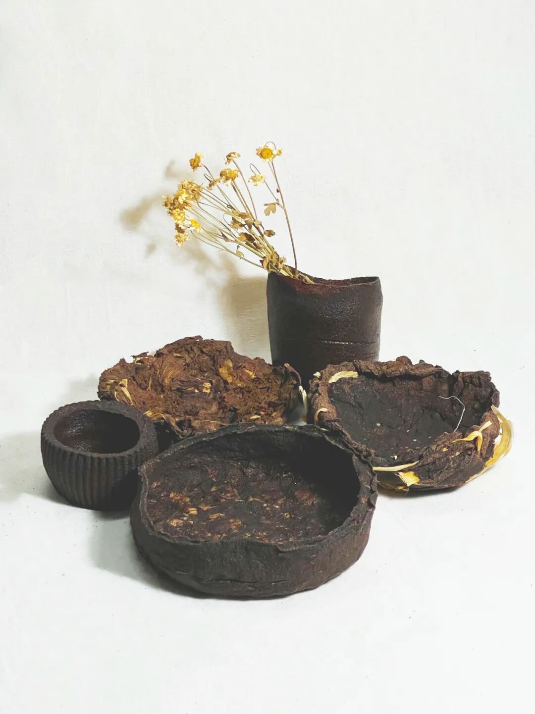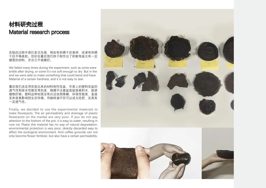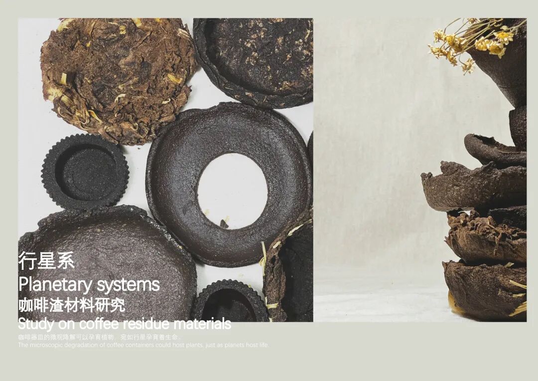 这是一组针对咖啡渣再利用的设计探索,将咖啡渣与其他有机废物调和,在多次实验中找出最合适的搭配材料,赋予咖啡渣新的使用场景和形态——充满禅意的花盆,既能够保持花盆透气性、排水性的使用条件,也能产生出花肥的效果。“咖啡器皿的微观降解可以孕育植物,宛如行星孕育着生命”。