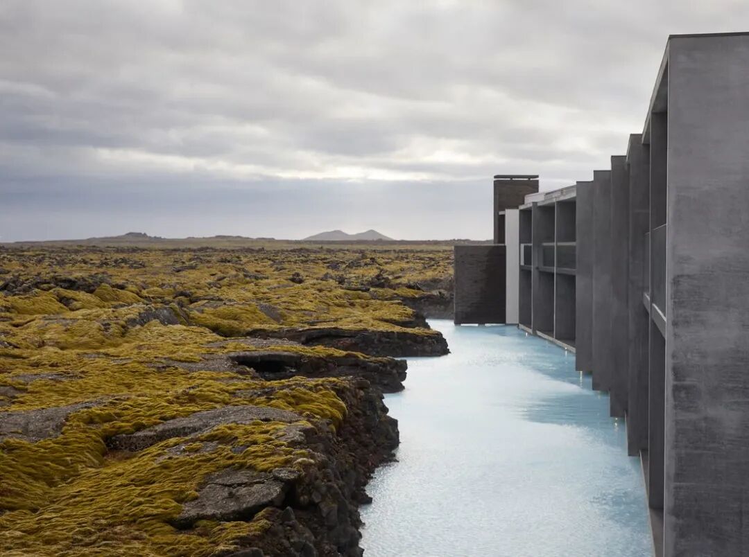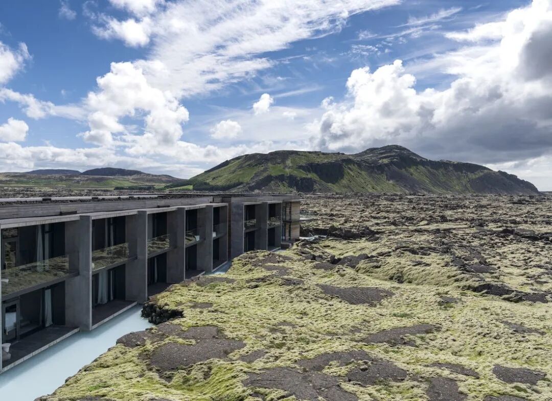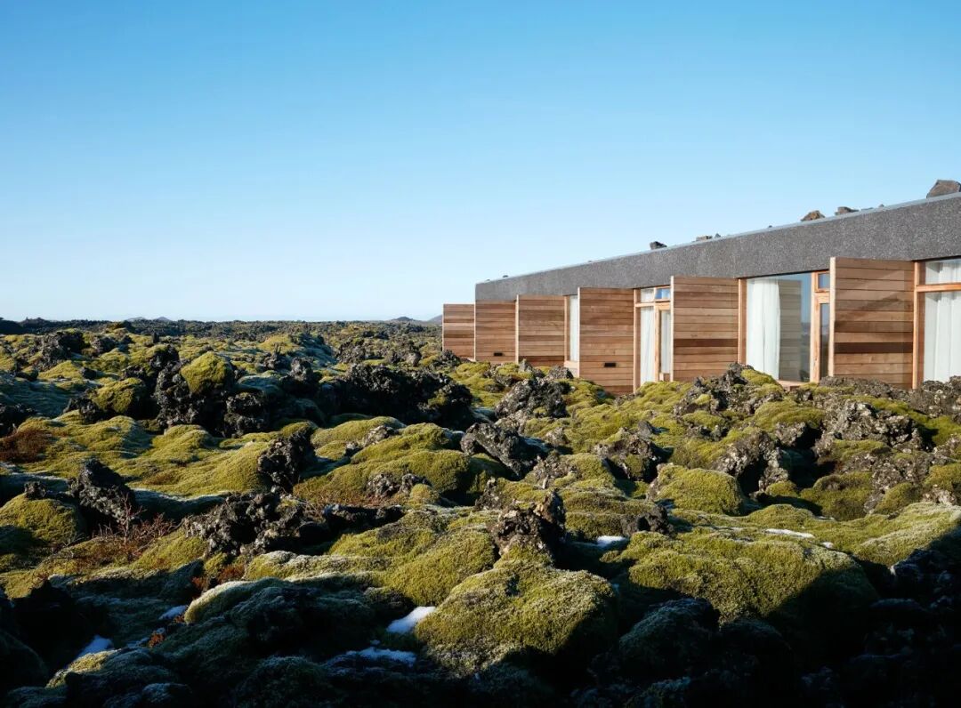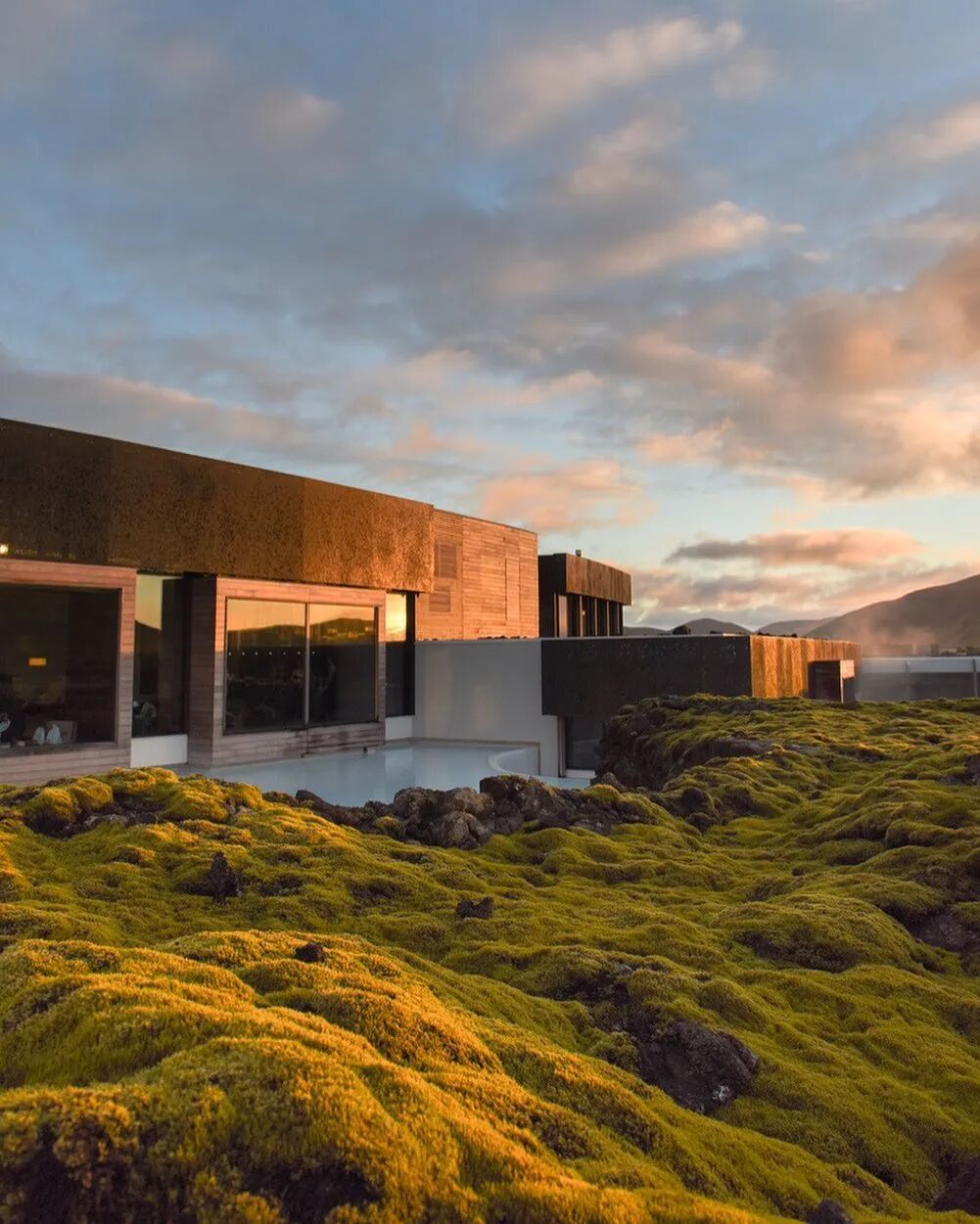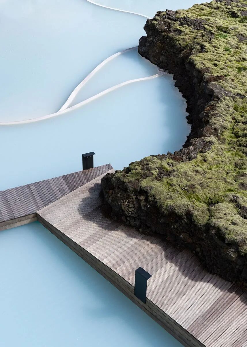 蓝色泻湖周围的景观——Illahraun 熔岩场——是公元 1226 年从地球上喷发而出的一片被苔藓覆盖的火山岩。为了保护熔岩和精致的、数百年历史的绿色植物,在 Retreat 的建造过程中实施了严格的指导方针。虽然建筑本质上是破坏性的,但人们付出了巨大的努力来减轻对令人叹为观止的地形的破坏。还创建了路径,使游客能够在熔岩区漫步,而不会损害精美的花卉和火山特征。以周遭苔藓、熔岩、泻湖等自然景观为主题,不仅能饱览冰岛绝景,更能就近体验蓝湖温泉。