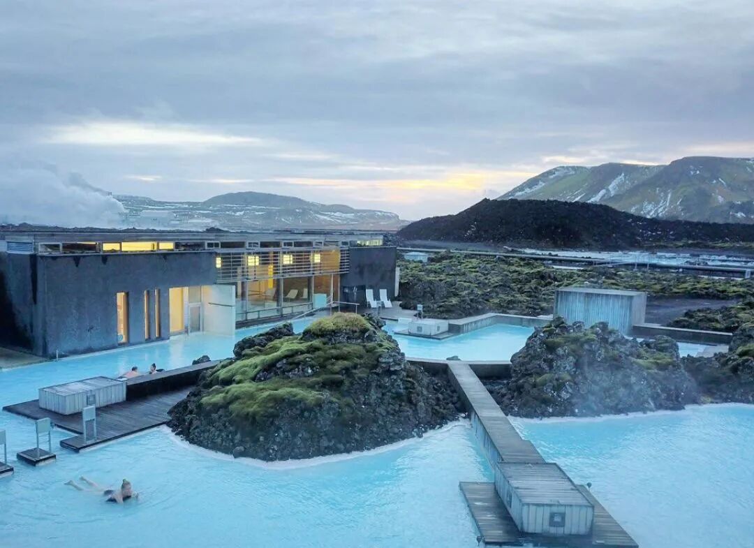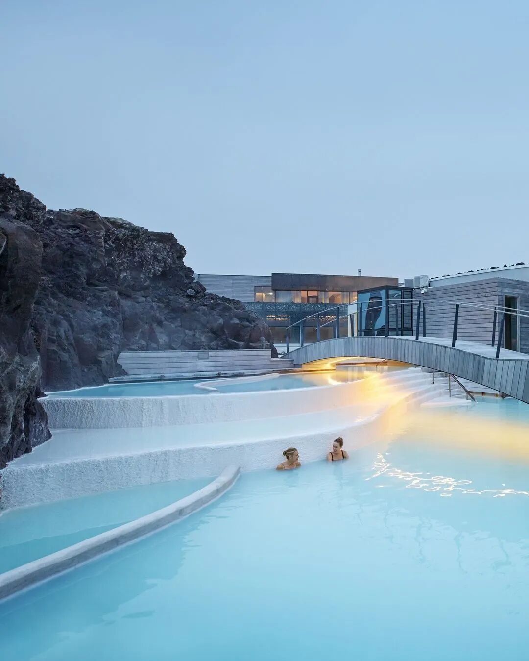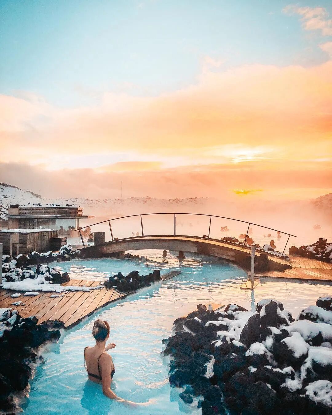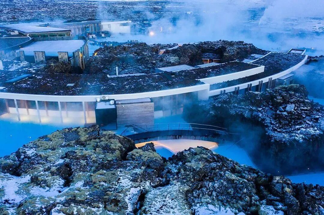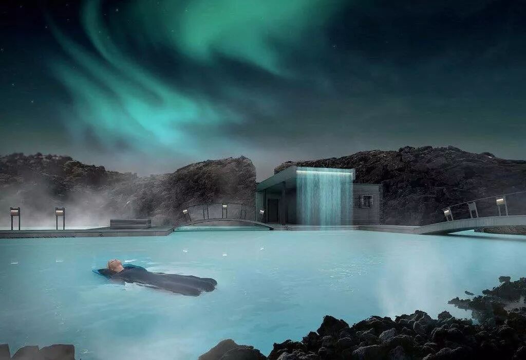 建筑与自然元素交织,蒸腾的水汽漂浮水面,带来丝丝温润的神秘感,夜幕降临,灯光亮起又是另一番独特的美景。天气好的话还可以见到极光。