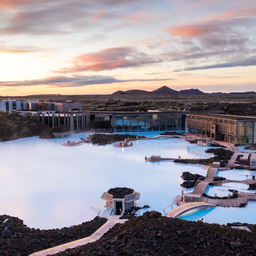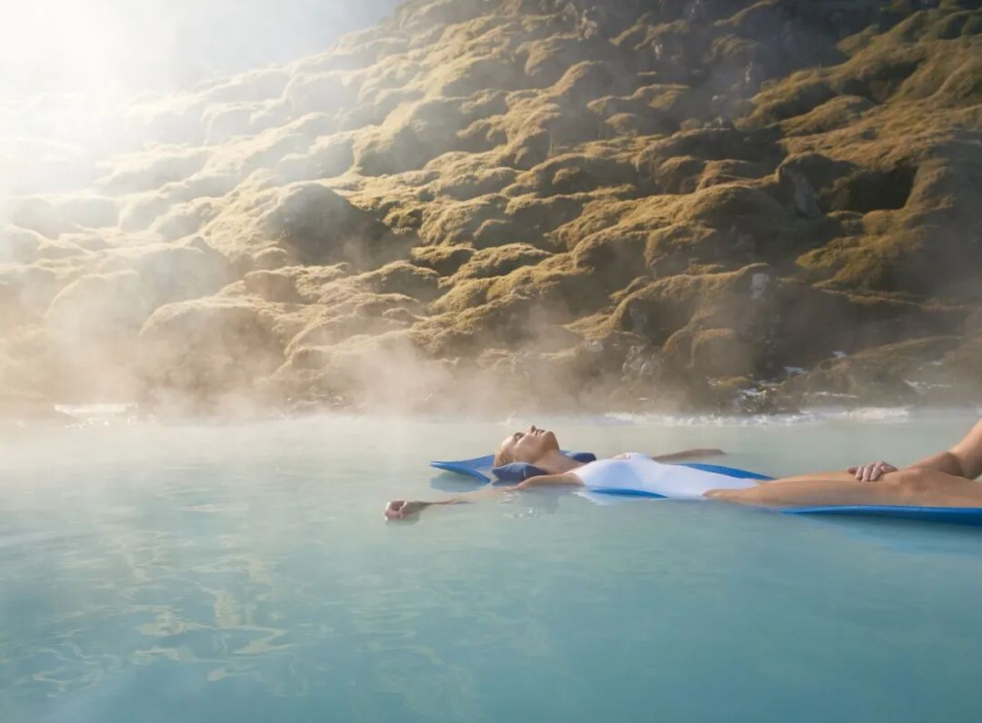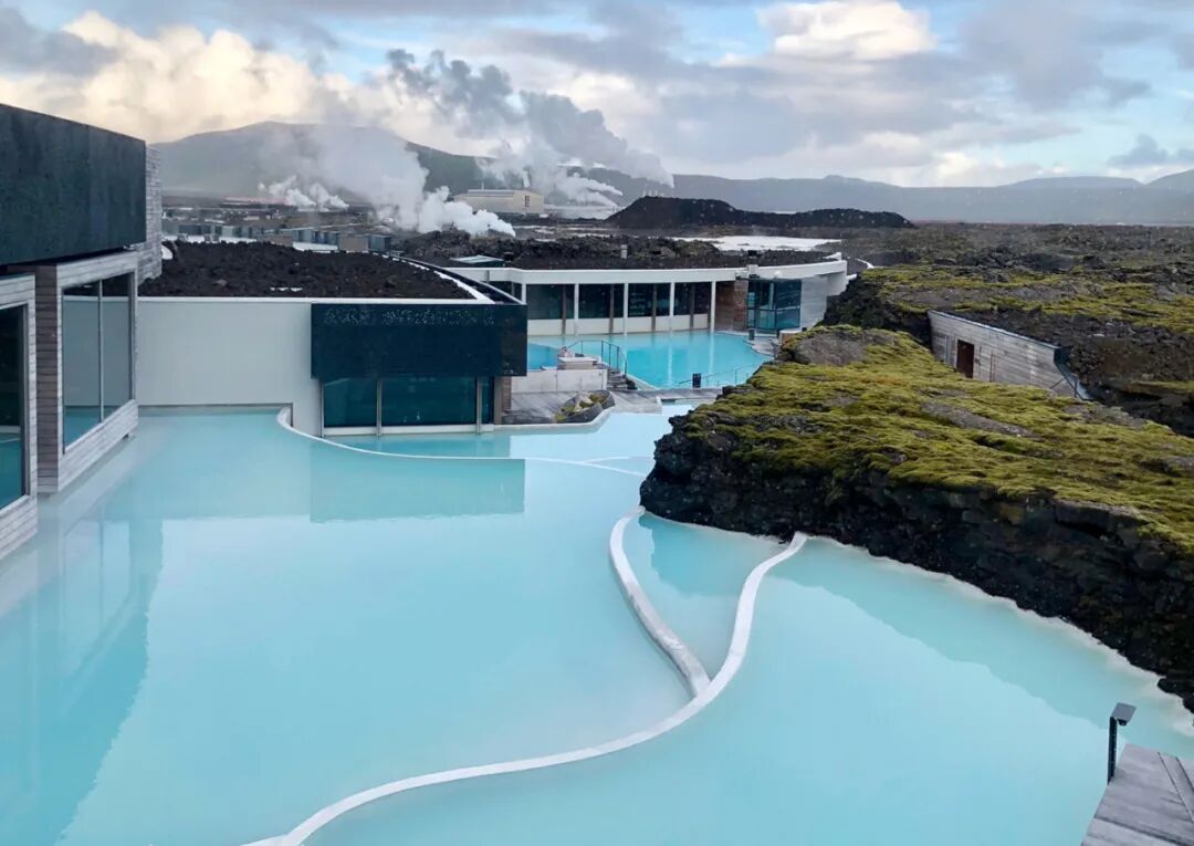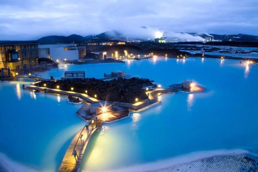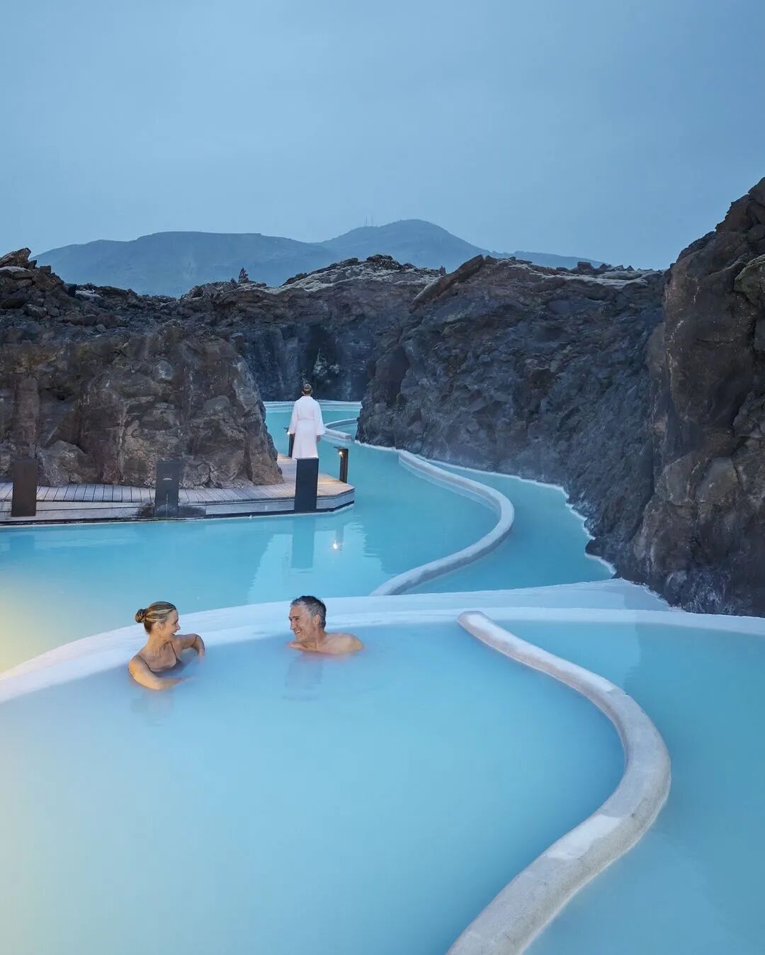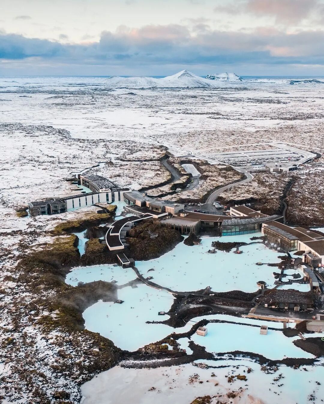 建筑与自然元素交织,蒸腾的水汽漂浮水面,带来丝丝温润的神秘感,夜幕降临,灯光亮起又是另一番独特的美景。天气好的话还可以见到极光。