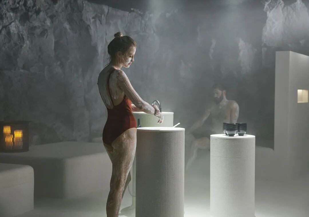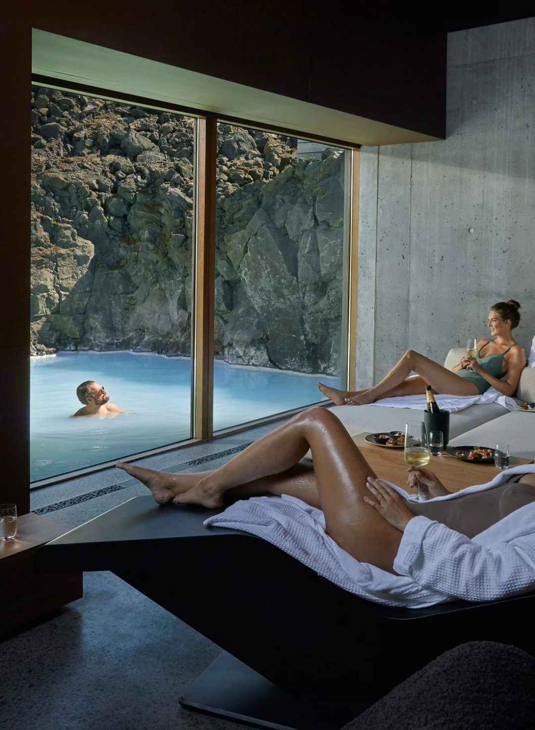 Retreat 的水疗中心是一个地下领域,可以进入和穿越火山地球,连接 Retreat 和蓝色泻湖,室内 SPA 从干蒸、蒸汽、按摩到泡池,从矿物盐、硅土到藻类物质的选用,水疗中心可以调动人所有的感官,由内而外地获取最极致的享受。