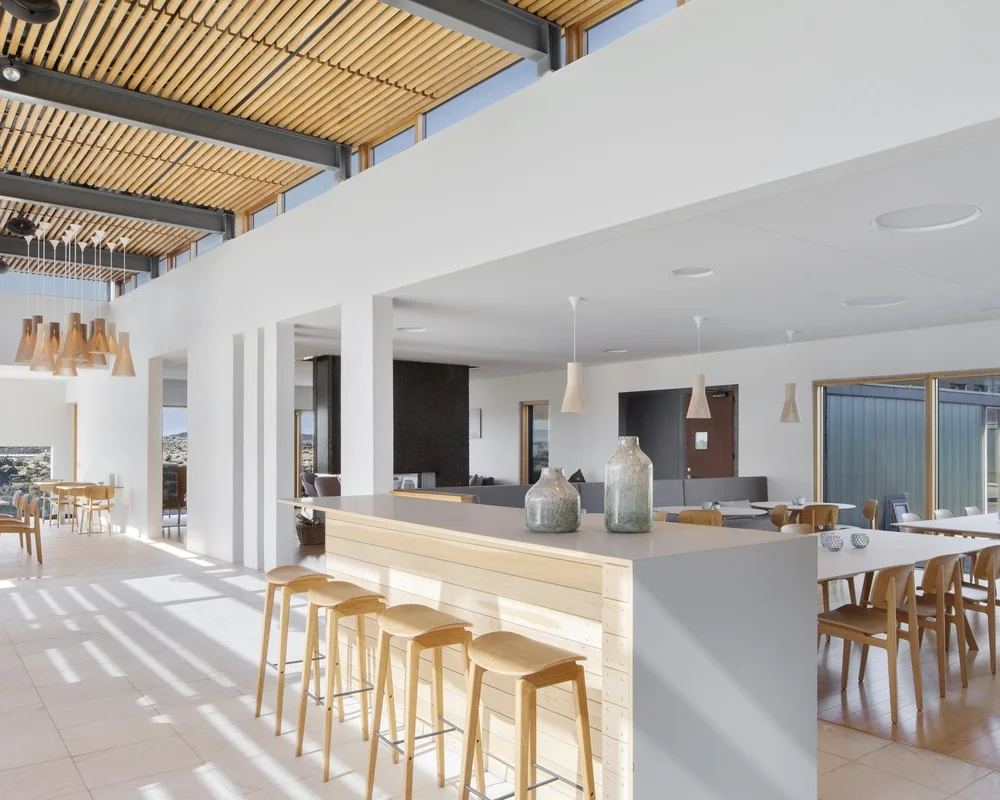 为了让建筑与环境无缝融合,Basalt Architects将各种自然特征加入到设计当中。裸露的熔岩形成了内外的墙壁,覆盖了屋顶。酒店接待区的前台、餐厅的厨师桌和酒吧内部,都可以见到原始混凝土、木材和熔岩,让游客住在酒店里也能领略到属于冰岛蓝湖的迷人风光。