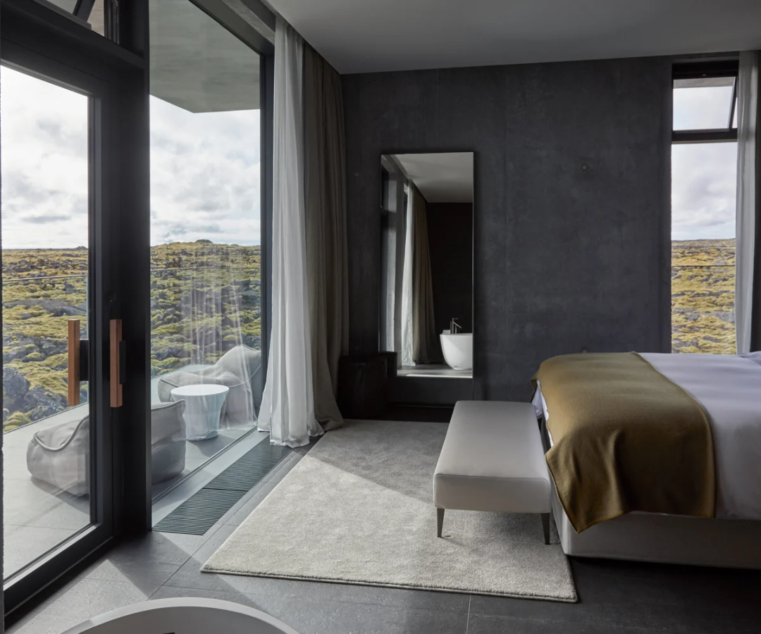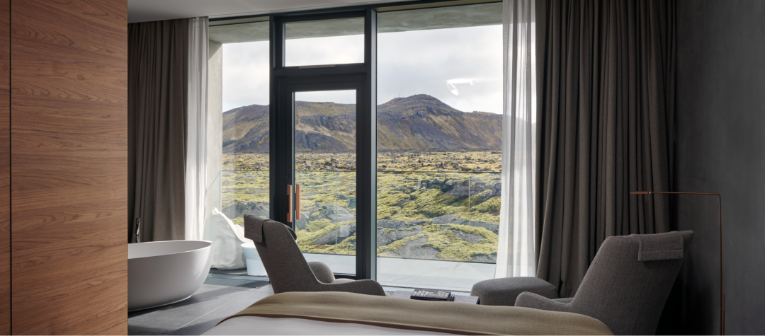 苔藓小型套房:玻璃墙通向不断变化的苔藓的全景。广阔的熔岩场展开到火山的地平线上。每间 Moss 小型套房都采用永恒的设计,将迷人景观的形式和色彩融入其中,与自然融为一体——营造出极度舒适的场所。