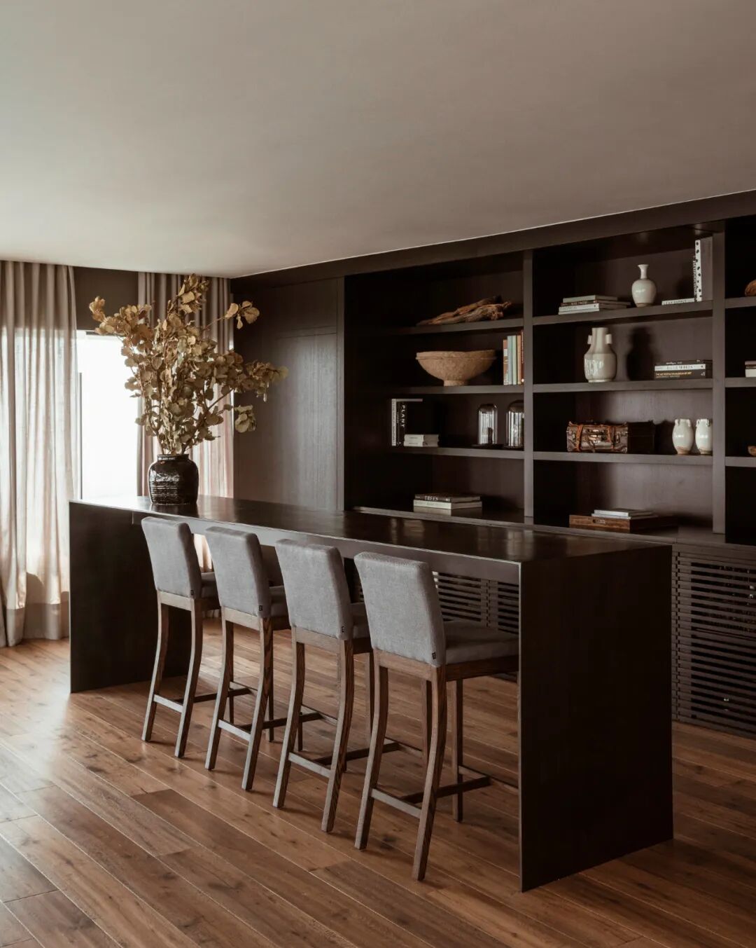 Before remodeling the condo felt cold and empty, it had finishes of red tzalam wood and gold Tepeji marble on bare white walls, and there was a lack of privacy and independence between the different living areas. In the new layout, private and common areas are markedly separate and independent from each other, and the use of a darker palette of materials and colors accentuates the new found cozy and intimate charm of each space.