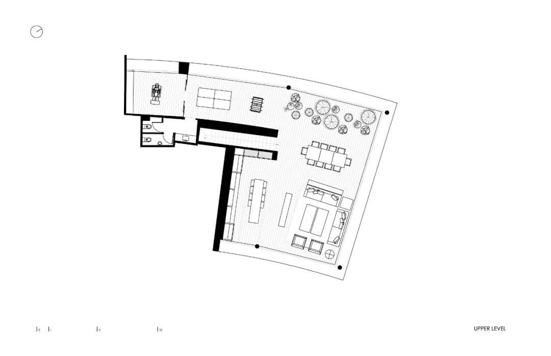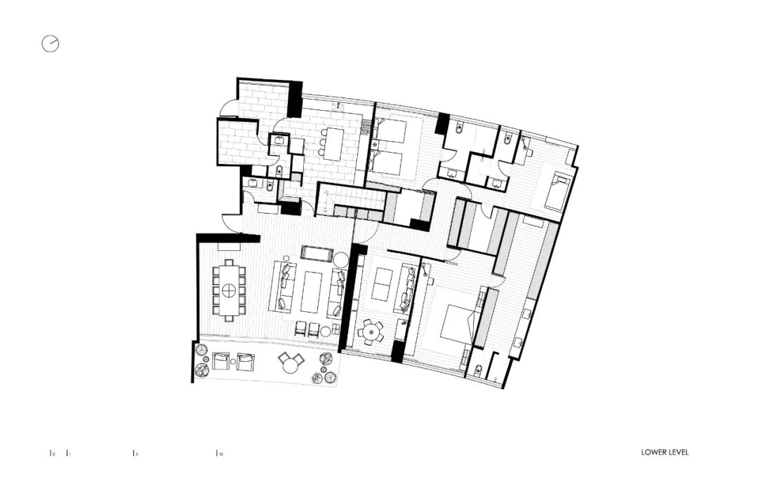 顶层公寓提供了令人惊叹的城市景色,可以从公寓的每个角落欣赏到。一楼是公共区域和厨房所在地。客厅和餐厅靠着一扇大窗户,这扇窗户为共享空间注入了自然光。一堵木板墙挡住了通往私人区域的通道——一个家庭间和三个套间,每个套间都有一个步入式衣柜。二楼的大型娱乐区设有电视室、酒吧、额外的餐厅、游戏室和健身房。