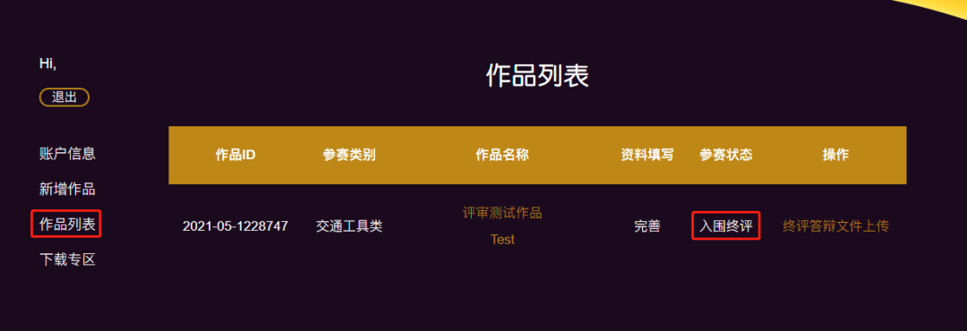 点击“作品列表”,查看参赛状态。如参赛状态显示 “入围终评” 即表明作品成功晋级终评。如显示“提名奖”即表明作品获得“提名奖”奖项。