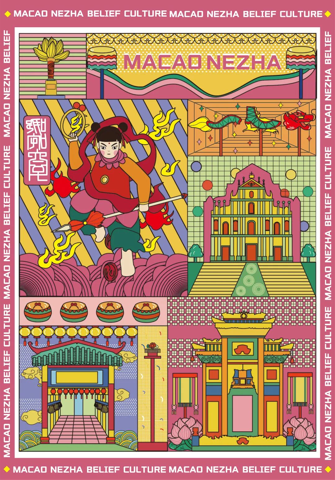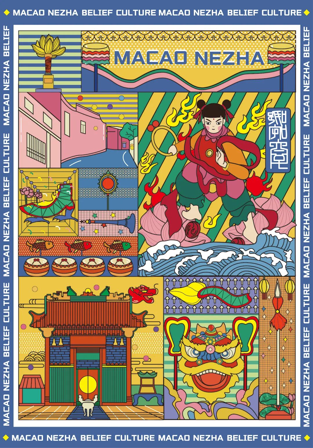 作品汲取了澳门哪吒信俗文化中的哪吒诞巡游、印平安符、抢花炮等仪式元素,并结合了哪吒庙、柿山哪吒古庙、哪吒庙斜巷、大三巴等特色建筑,整体采用了孟菲斯风格的插画形式与当地文化特色结合,以轻松的形式展现澳门哪吒诞期间的热闹气氛。