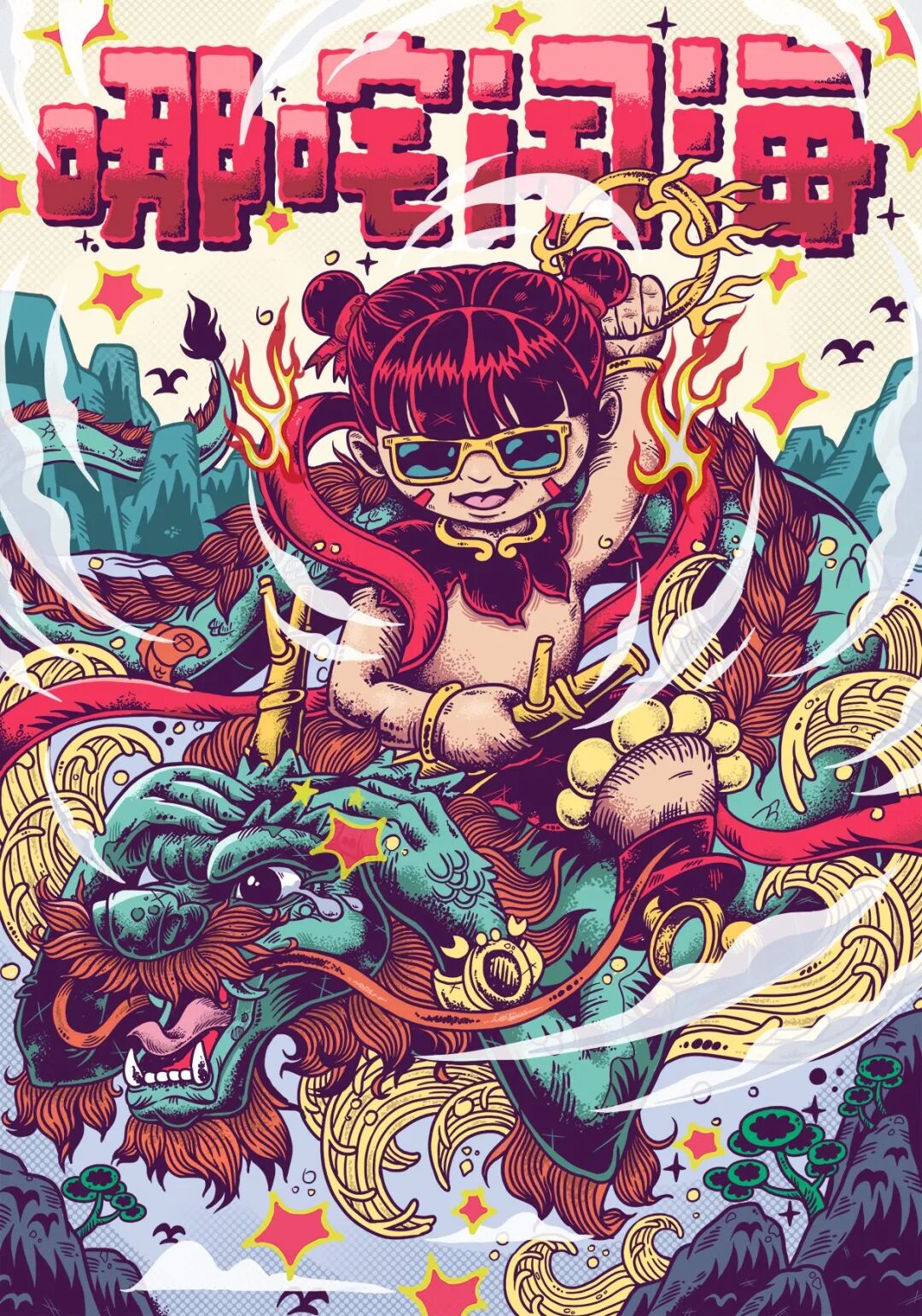 卡通潮流插画哪吒闹海,哪吒坐卧在龙王身上,做打击状,龙王的颓靡衬托哪吒的威武,颜色复古加上一些波点显得耐看。