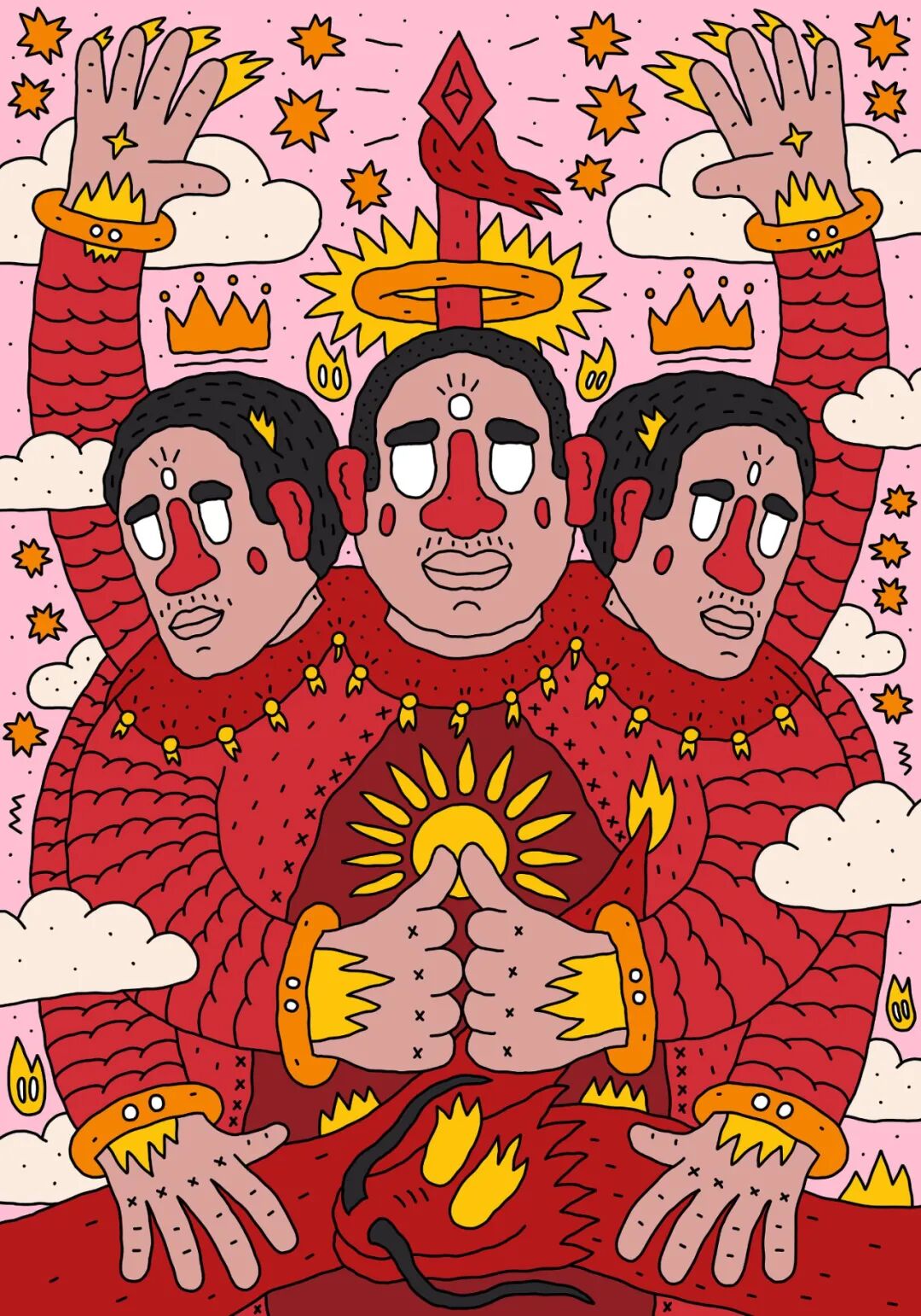 作品捕捉了神的存在及其神圣特征。艺术家描绘了漂浮天上的大神,背后是有象征意义的神主题图形,下方有一条,象征着他在精心照顾的所有生灵。