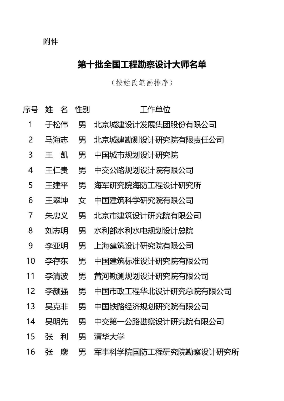 近日,住房和城乡建设部公布第十批全国工程勘察设计大师名单。根据《全国工程勘察设计大师评选与管理办法》,住房和城乡建设部组织开展了第十批全国工程勘察设计大师评选工作。经审定,决定授予于松伟等35名同志全国工程勘察设计大师称号。