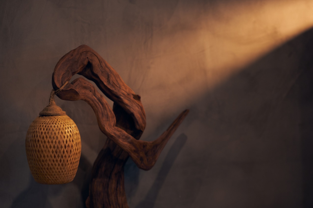 从空间打造到细节装饰,都体现了对自然的尊重以及对手工艺制的崇尚。承袭了侘寂特色与自然共生的文化,全室以朴素、寂静打造;在偌大的空间里有着不经意堆砌的藤编家具和木造的家具桌椅都有着侘寂痕迹,粗糙的家饰少了落后的气息,多了抚慰人心的温度。