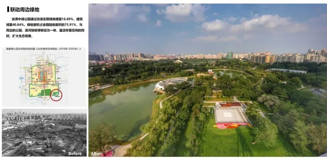 团队通过连接京城水网,恢复龙潭湖地区作为北京内城重要蓄洪区的功能需求;联动周边绿地,盘活存量空间的同时,扩大生态容量,拓展城市绿地系统的各项功能;结合现有林地的各项生态指标,分类梳理现有林木,通过复层混交、异龄更新、丰富色彩、突出水岸等方法形成生态结构稳定,林貌丰富的城市森林。