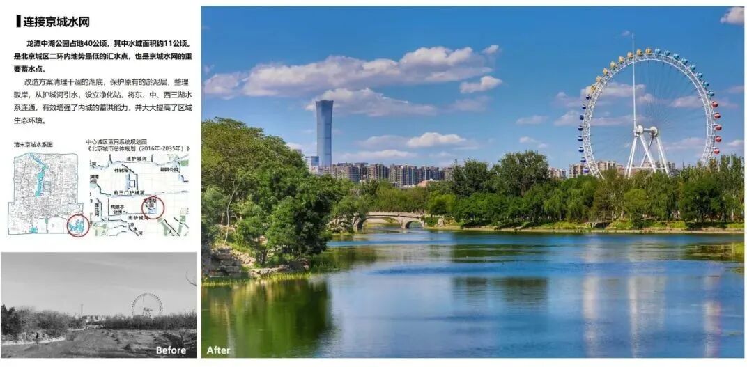 龙潭中湖公园位于首都功能核心区,占地39.8公顷,其中水域面积11.7公顷。元代时,龙潭湖地区只是大都城外的一片低洼地,而明清时期又成为窑厂。民国年间,成为城市污水的汇聚地。新中国成立后,政府通过整治,将常年积水的洼地、窑坑、苇塘连通形成东、中、西三个人工湖。1985年,中湖被改建为北京游乐园,是北京最早的一处大型现代化游乐园。2010年,游乐园合同到期,公园便一直处于闲置状态。2018年政府将其定性为城市综合公园,经过改造和施工于2021年面向公众免费开放。