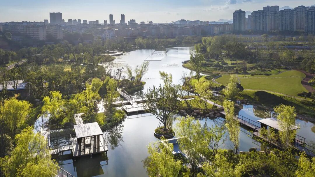 项目采用全新生态绿色设计理念,在湿地区域设置了多个鱼形绿岛模拟群鱼洄游的形态;将 海绵技术与景观深度结合,利用先进的GIS技术模拟现状真实地形及水动力方向等,计算出合理的海绵设置区域;将植物渗入步道的行走感观中,丰富步行的空间感受;采用生态本土材料与低介入手法,力求设计对原生生态影响降至最低;建立生态特色杉林系统,营造出四季可赏的自然生态郊野环境。