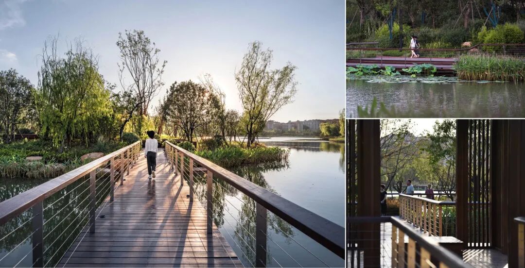 这里不仅是市民的城市休闲公园,也是“海绵”的滨水生态公园。通过堤岸生态化、增加植被覆盖率、设置滨水缓冲带,旱季可调节局部生态气候.设计上考虑 适度留野,在公园绿地中保留了部分人类低干扰区,配置食源、蜜源植物并结合湿地种植带和自然岸线,因地制宜,设计充分利用场地现有土方进行平衡,材料选择注重低碳环保,植物多选用乡土品种和低维护植物,在传递设计美感的同时做到了低碳和经济节约。