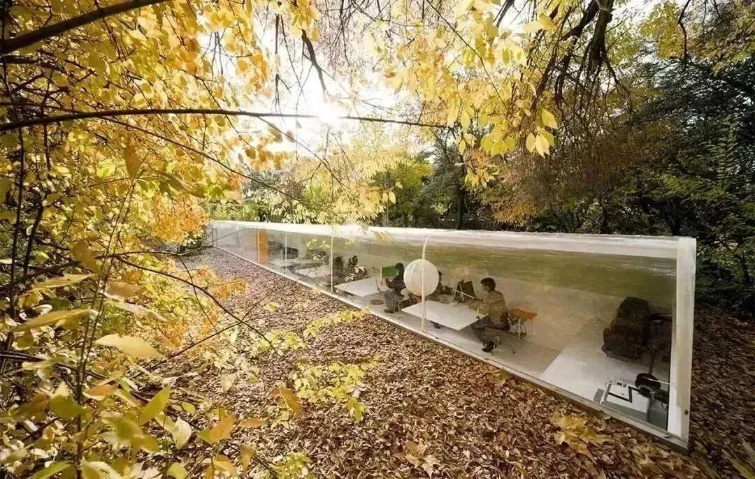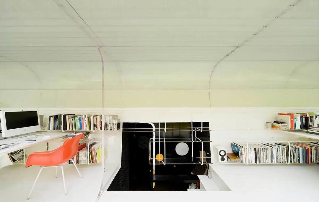 这个工作室的目标很简单:在树下工作。为了做到这一点,设计团队需要一个尽可能透明的屋顶。同时,设计团队需要将办公桌区与阳光直接隔离。因此才有了透明的北边部分,使用20mm厚的无色有机玻璃弯板覆盖。在办公桌所在的南侧,必须被更多地封闭,但不能完全封闭,所以在这部分采用双层玻璃纤维和聚酯材料,是自然的颜色,中间是半透明的绝缘材料,三者的组成像是110毫米厚的三明治。在中间,设计团队安装了半透明的白色聚乙烯绝缘泡沫,以保持半透明性。透明部分是由弯曲的有机玻璃标准片制成,边缘进行打磨,在玻璃板之间注入密封剂,在钢框架的两侧安装10mm厚的乳白色甲基丙烯酸酯材质层,这个装置可以通过滑轮系统完全打开来保证空气循环。建筑置于半地下,可以提供水平的视野。置入地下的部分主要是木模板浇筑的混凝土(地基)和地板,用以地面找平和固定螺栓。建筑的地板粉刷成两种颜色。下雨的时候,雨滴会打落在建筑上,有时候轻微,有时急促,会发出声音,也会给建筑带来湿润的触感。